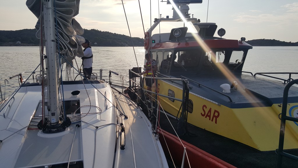 Tar kontakt med Sjöräddningssällskapet Fjällbacka. Nu glider vi dit på storen.