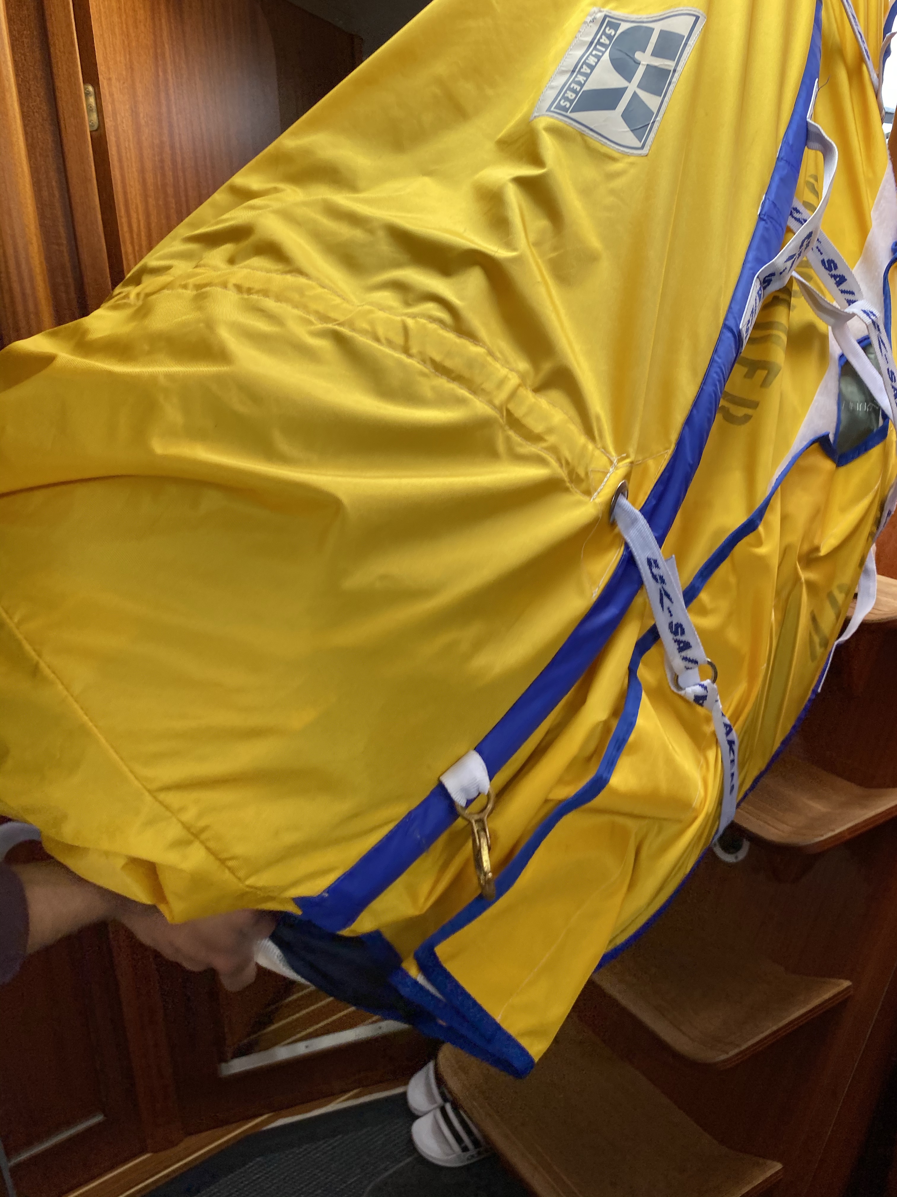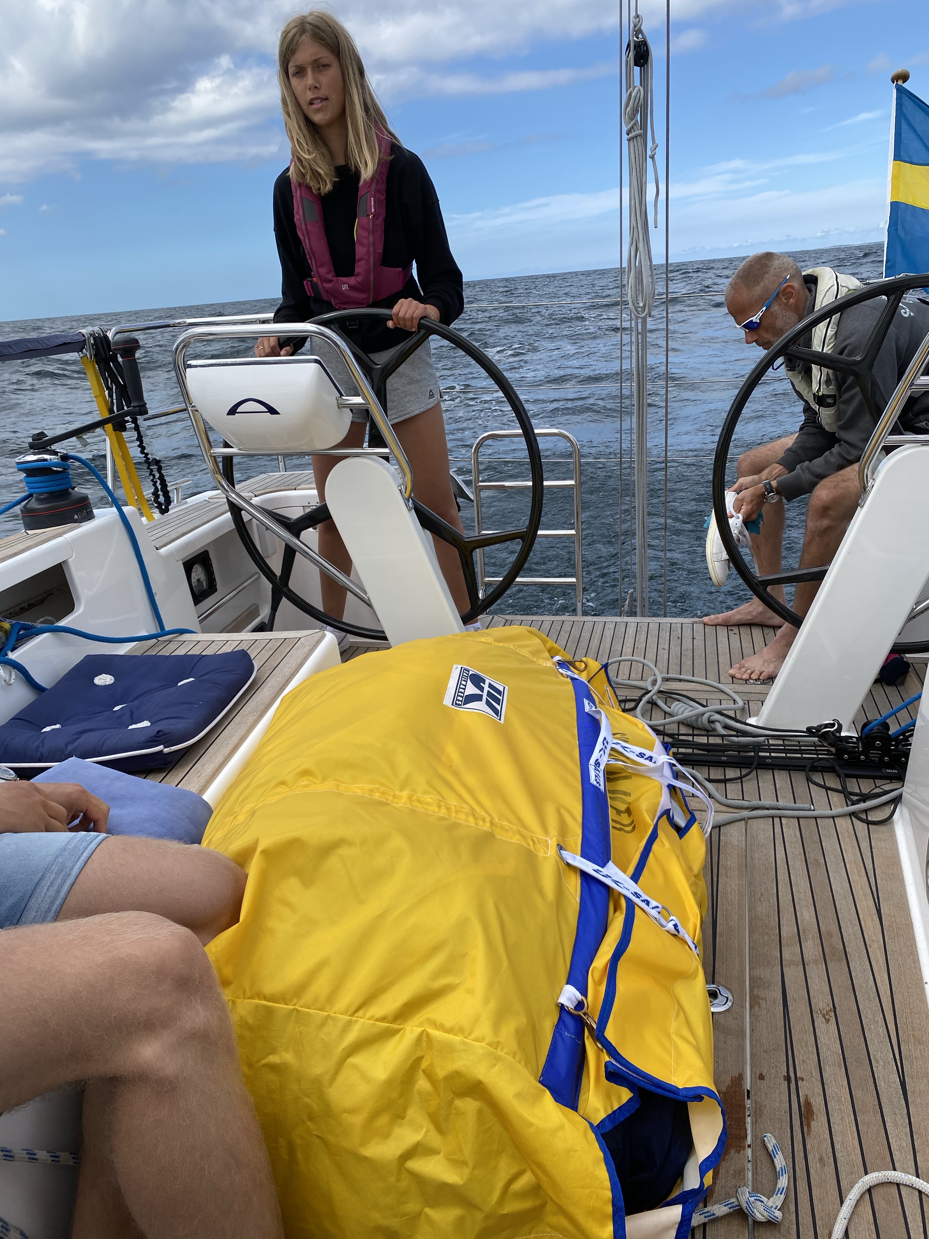 Rätt mycket pyssel att få den på plats. Och stökigt med gammal sjö som rör till det. Men fint är det. Och snabbt går det. Jättesnabbt. Toppnotering på 10,8 knop. Fördäcksgasten Nisse är kvar ombord. Tyvärr inte hans solbrillor.