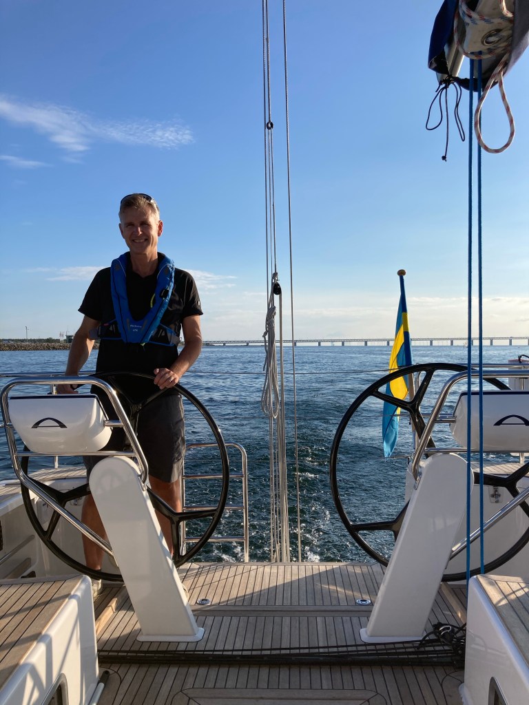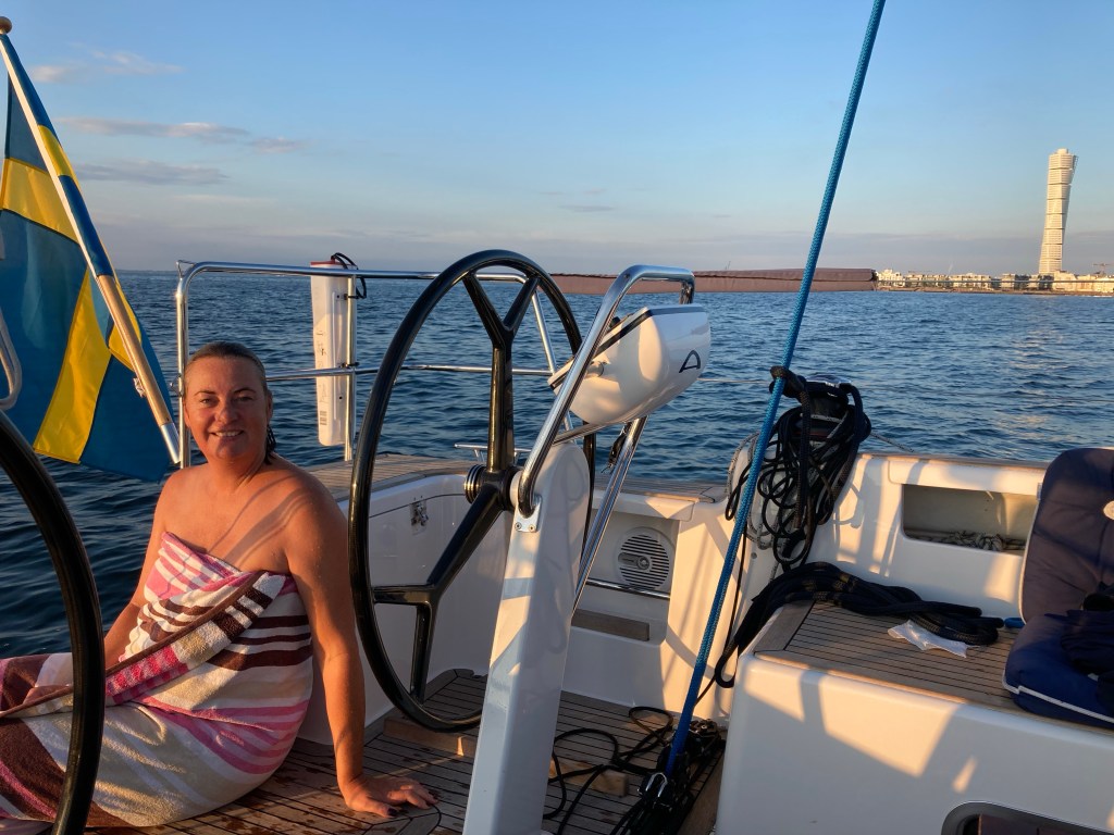 Ännu en jättevarm dag på land fick oss (Johan och Kristina) att ta en liten motortur på kvällen efter jobb, för kvällsmat och kvällsdopp. Vi testade ankarspelet för första gången, strax utanför Ribban. Efter lite knappfipplande fick vi till nersläppet. Det krävs nog lite mer övning för att det ska gå som på räls. Upptagningen var betydligt enklare. Skön kväll i sittbrunnen!