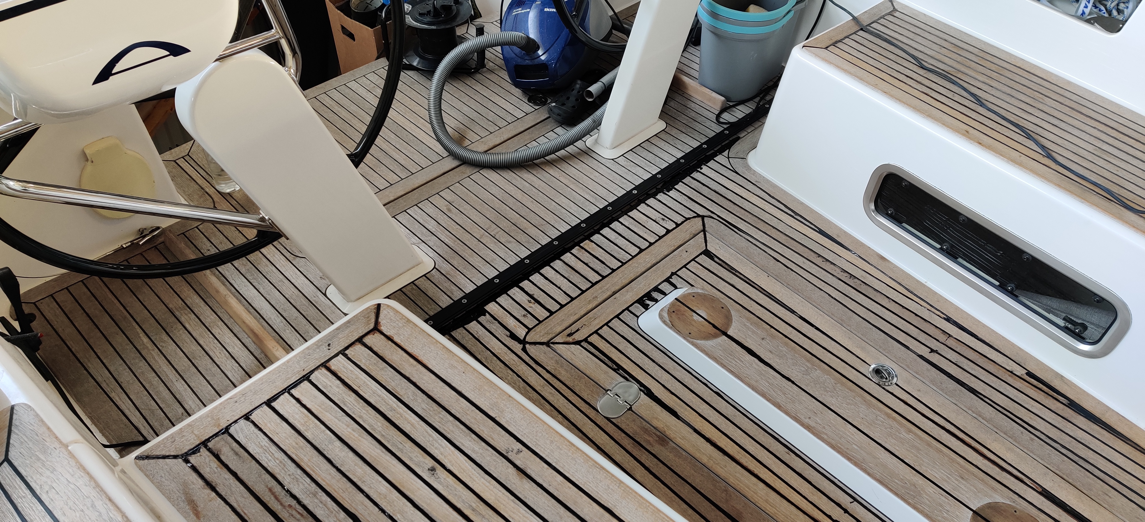 Då har vi kämpat med omläggning av nåten i sittbrunnen. En inte helt enkel manöver. Kräver både tålamod och ett gott handlag. Johan tog sig an skär och slip och Per koncentrerade sig på nåtningen. Kladdigt.