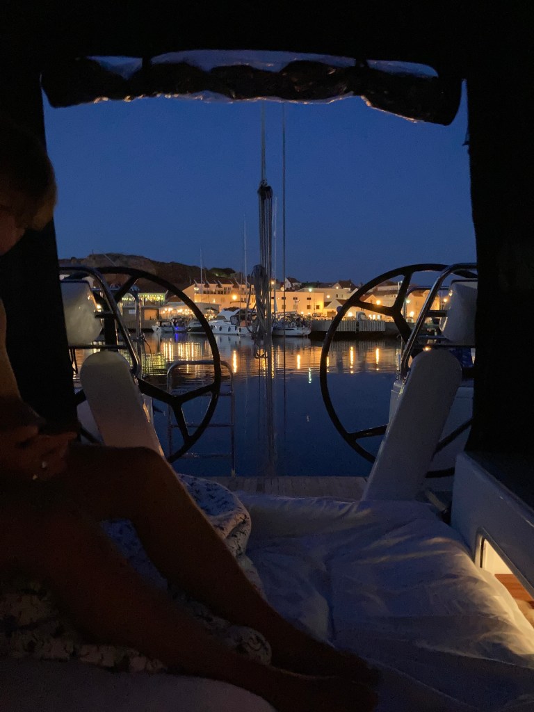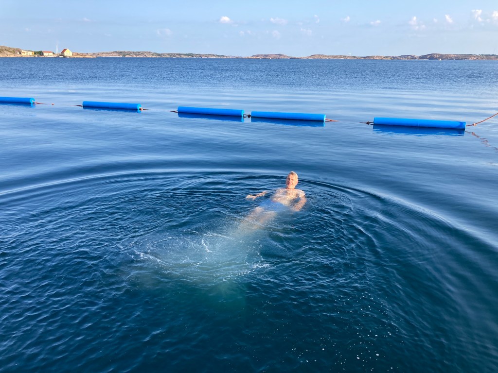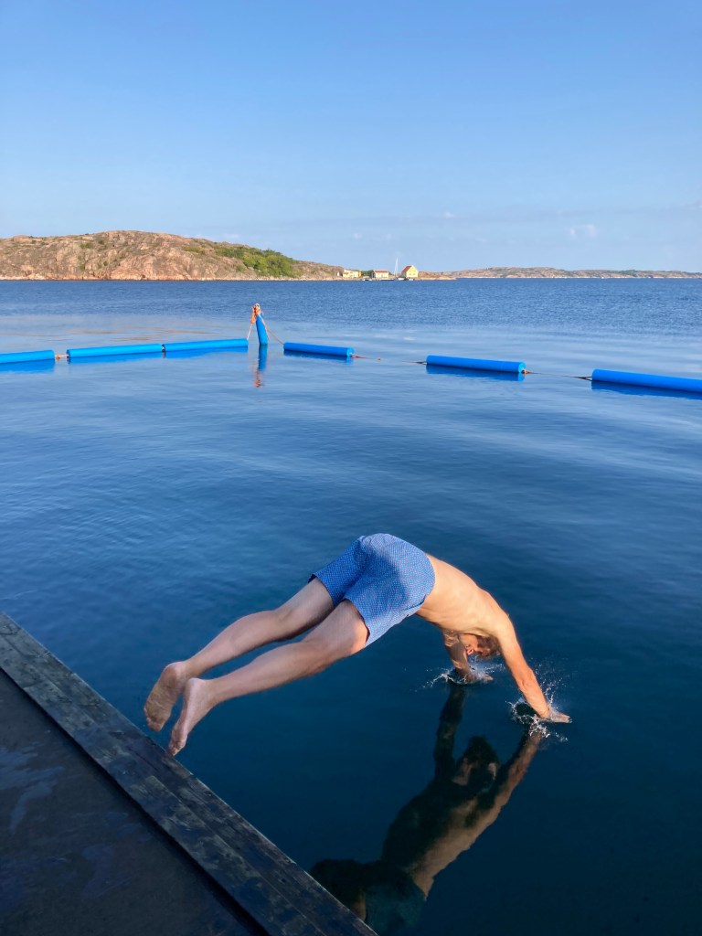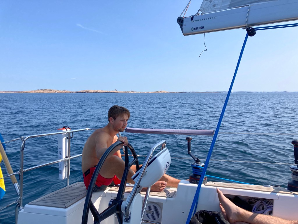 Gossarna var förvånansvärt pigga, åtminstone efter morgondoppet. Vi lämnade Hasselösund och Smögen och seglade i en vid lov runt Hållö för att lapa sol och vind denna sista segeldag. Siktet var inställt på Brandskären för att ligga på svaj en stund men där var det svårt att hitta lämplig plats för vår gigantiska båt så det blev motorgång in mot Lysekil istället. Norra hamnen var rymlig och mysig på samma gång, med en skön liten badplats på piren. Dags för Malmölembre + excellenta gastar Oscar och William att tacka för sig och Nackalembre att mönstra på. Vilken fin vecka, tack Blåvinge, skeppare, besättning och väder och vind!