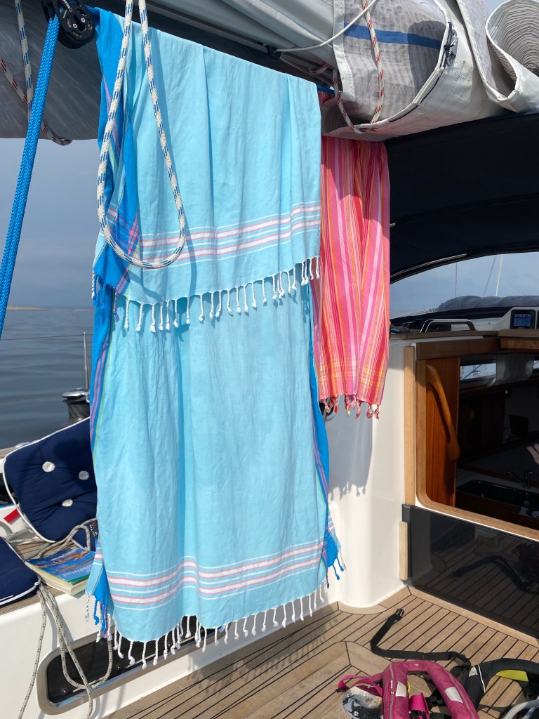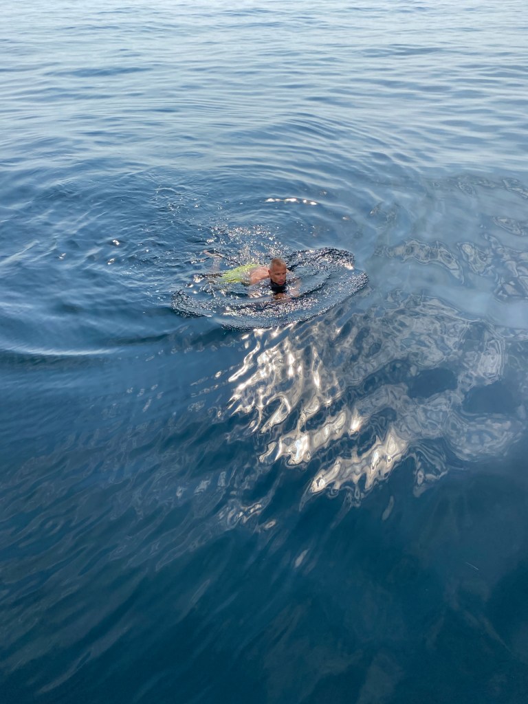 Vi toppar i 9,9 men när skepparn klantar sig med rodret och nästan sköljer fördäcksgastarna över bord känner besättningen att vi ska spara adrenalinet lite till nästa äventyr. Vi går i bidevind in mot land. Det blir mysväder och bad från båten.
