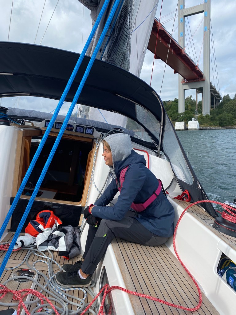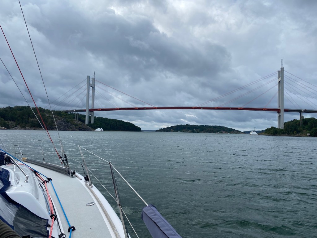 Går under Tjörnbron med god marginal. Stökiga vindar 9 m/s SV som utmanar rorsman. Två rev över Hakefjorden gör det lite mer behagligt.