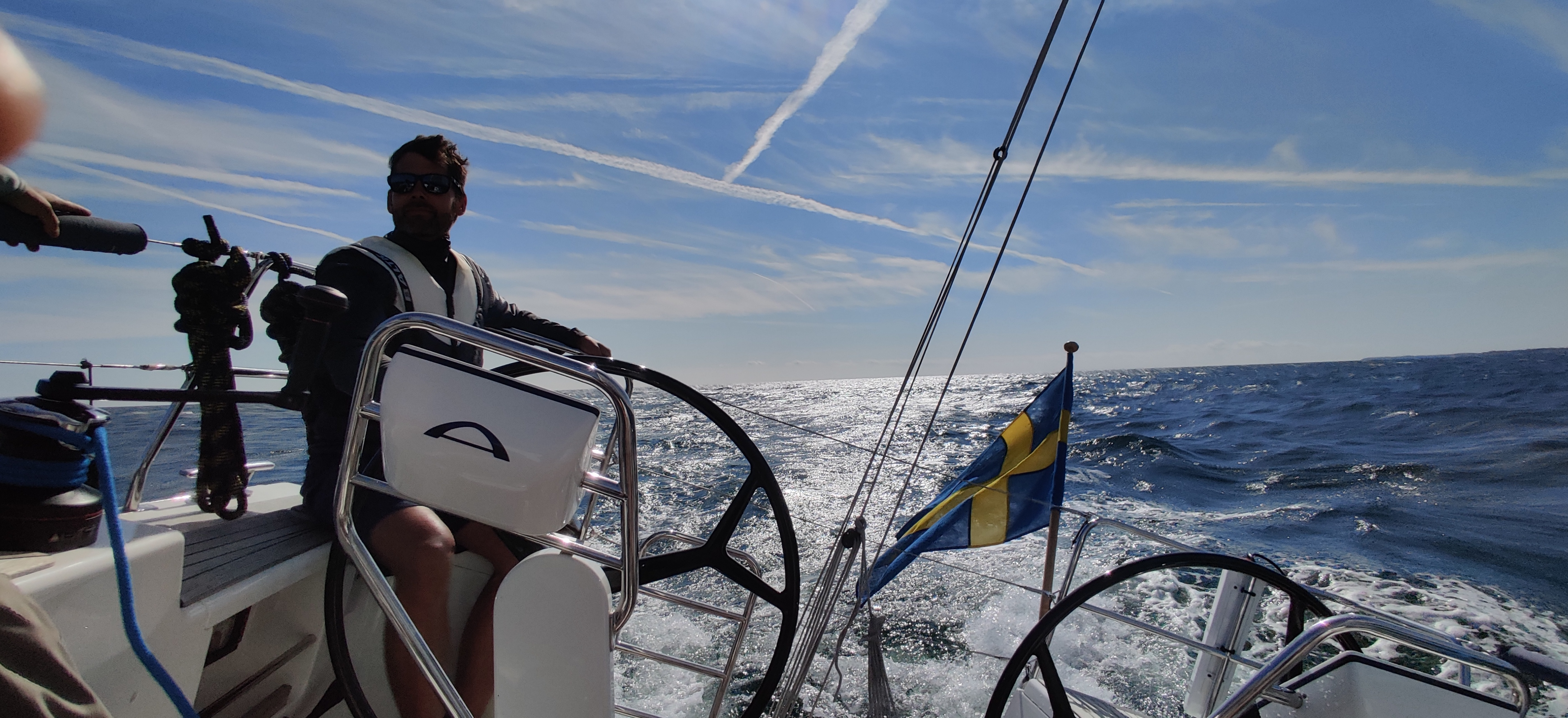 Efter att ha trocklat ut Blåvinge från fiskestängerna längs Stevns klint ökar vinden och vi kan lätta lite på skoten. 9 meter per sekund och stadiga 8,5 knop. Solen i ryggen!