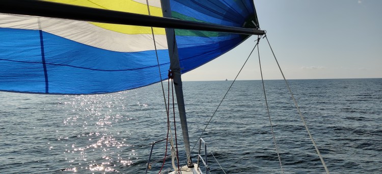 Och mycket riktigt kommer spinnaren upp ganska snabbt. Men det lättar ur betänkligt. Vid Drogden så pass att det blir att puffa iväg någon halvtimme för motor innan vi kan sätta igen. Det vrider något mot Väst och vi får halvvinda söderut.