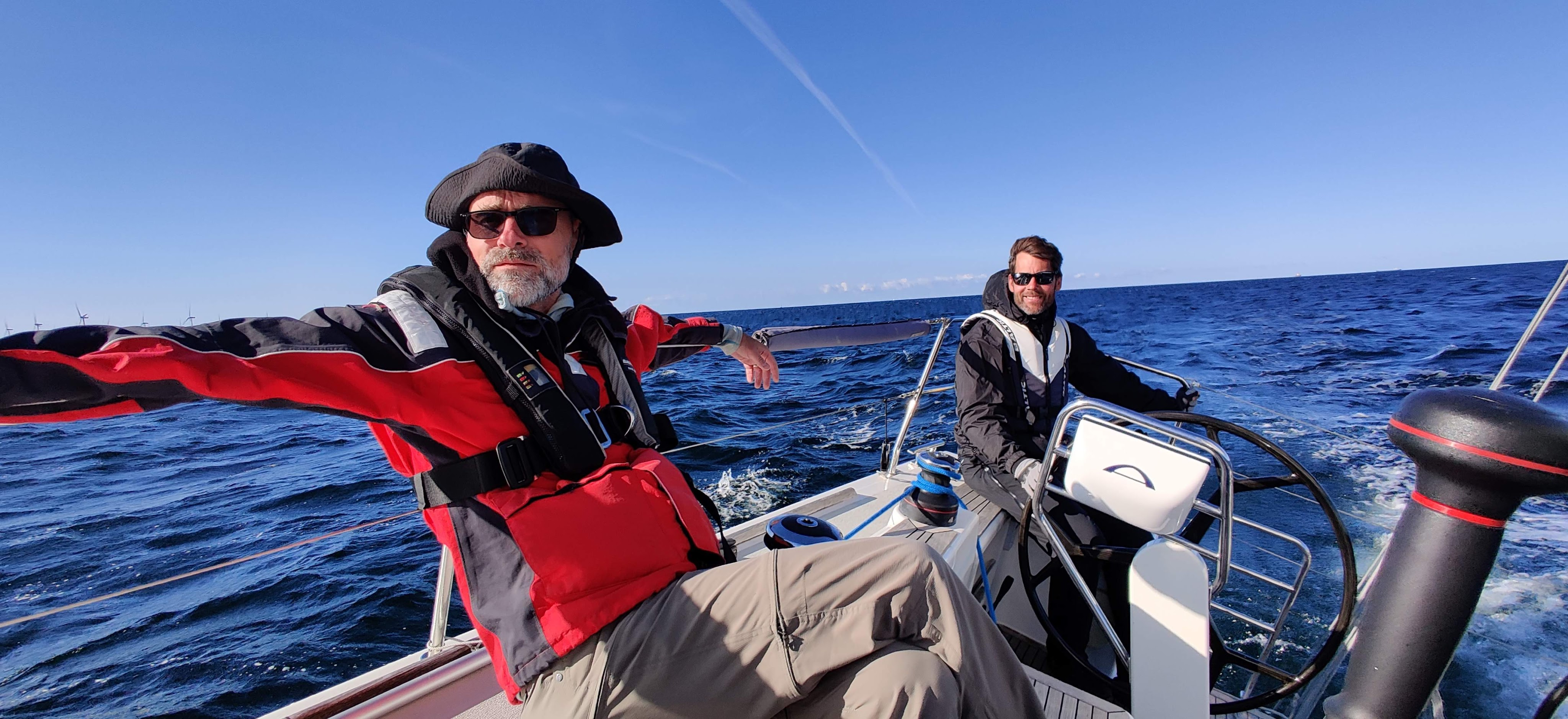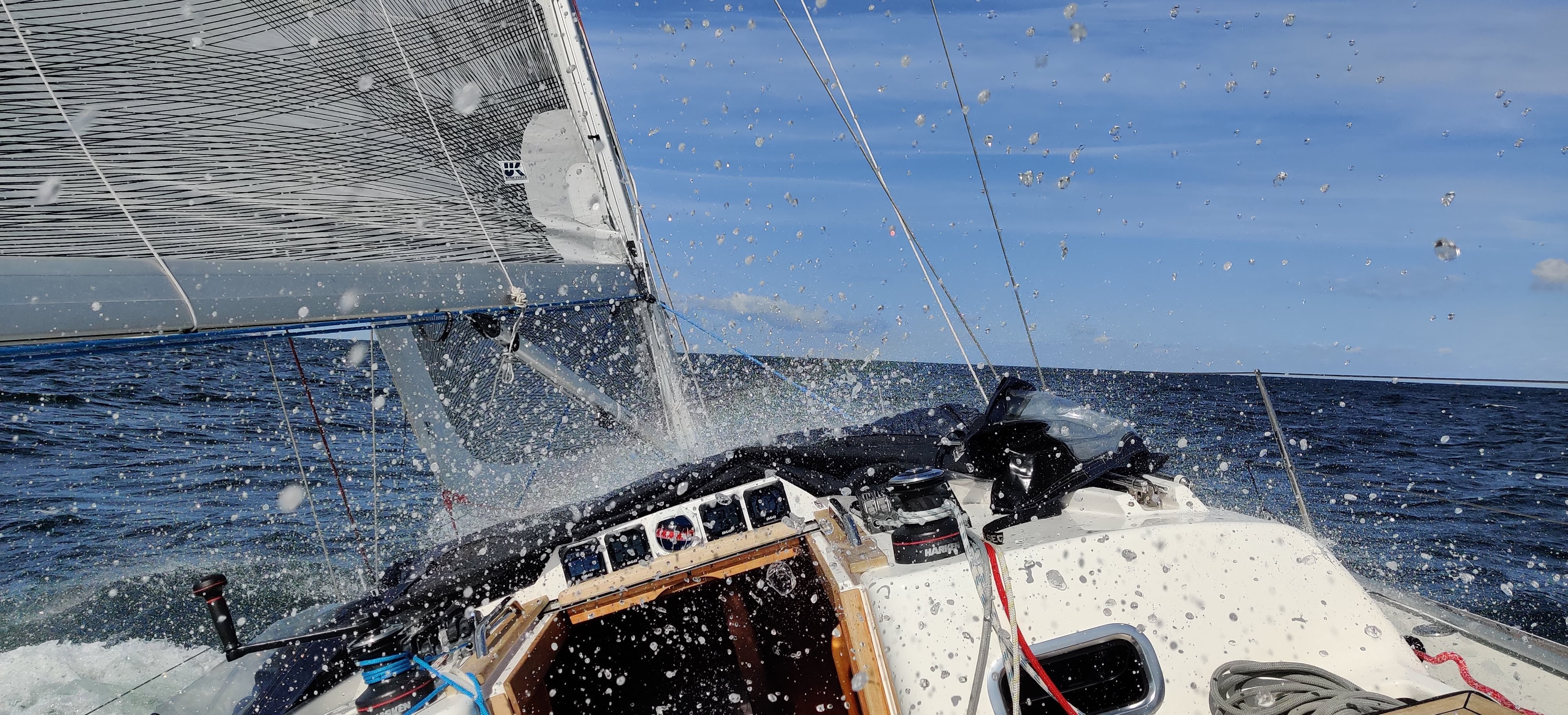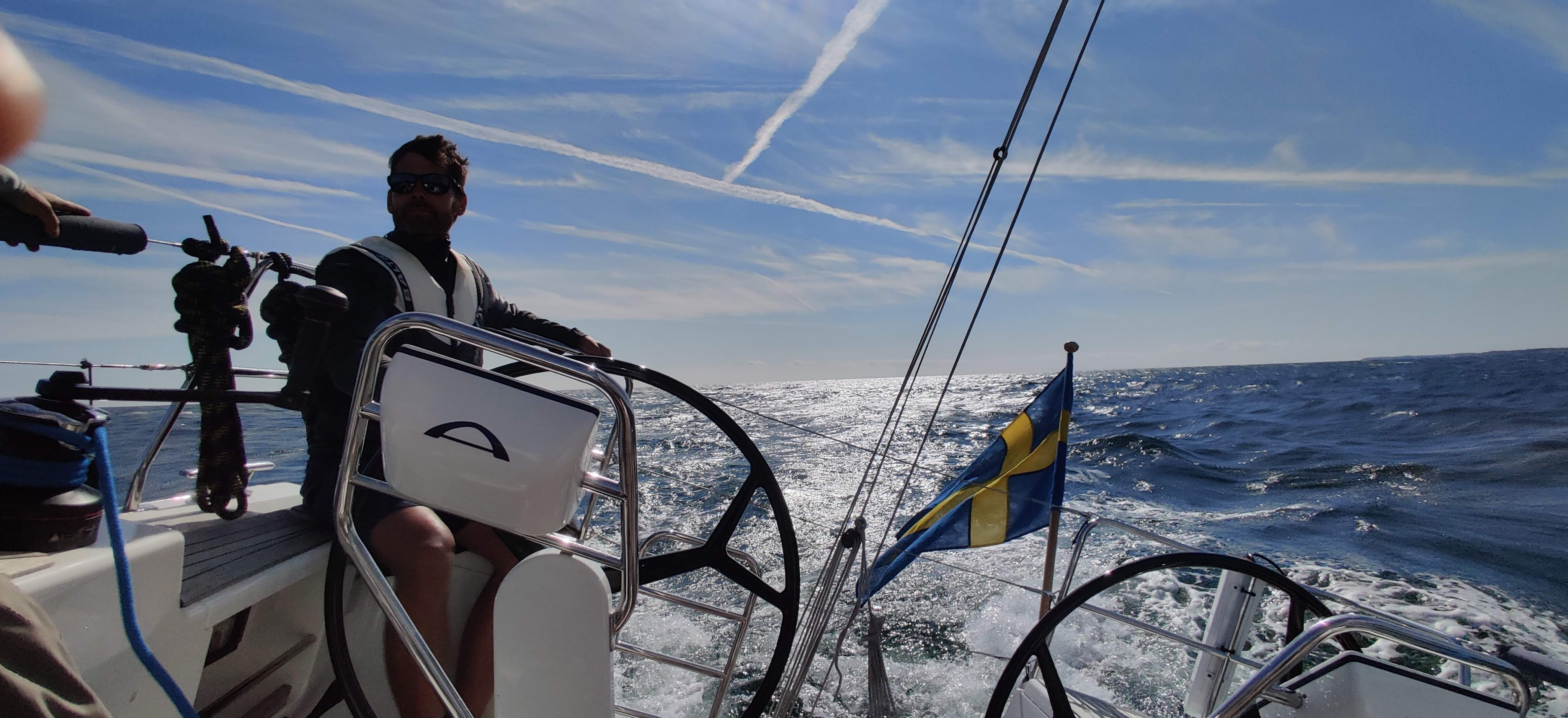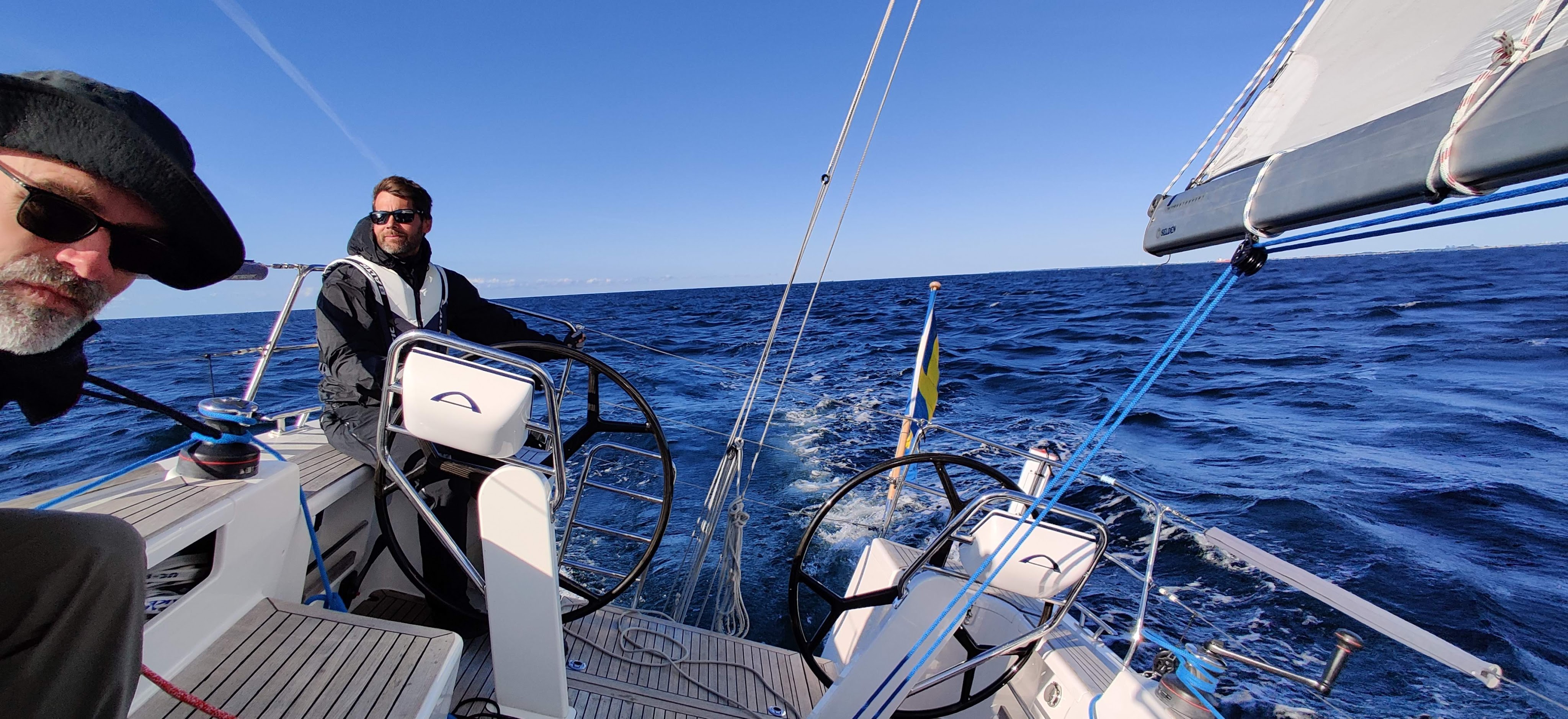 Vi hinner med glass och kaffe innan vi vid lunchtid lättar och drar till havs igen. Det blåser upp en del och vi får rejäl motsjö från hela södra Östersjön. Man glömmer lätt att det är ett stort hav i ostlig riktning. Smörgåslunch och vi får till och med ta ett rev när vinden är uppe och vänder runt 10 m/s. Halvvind och goda 8.5 knop med sköna stänk in i sittbrunnen. Vi lever!