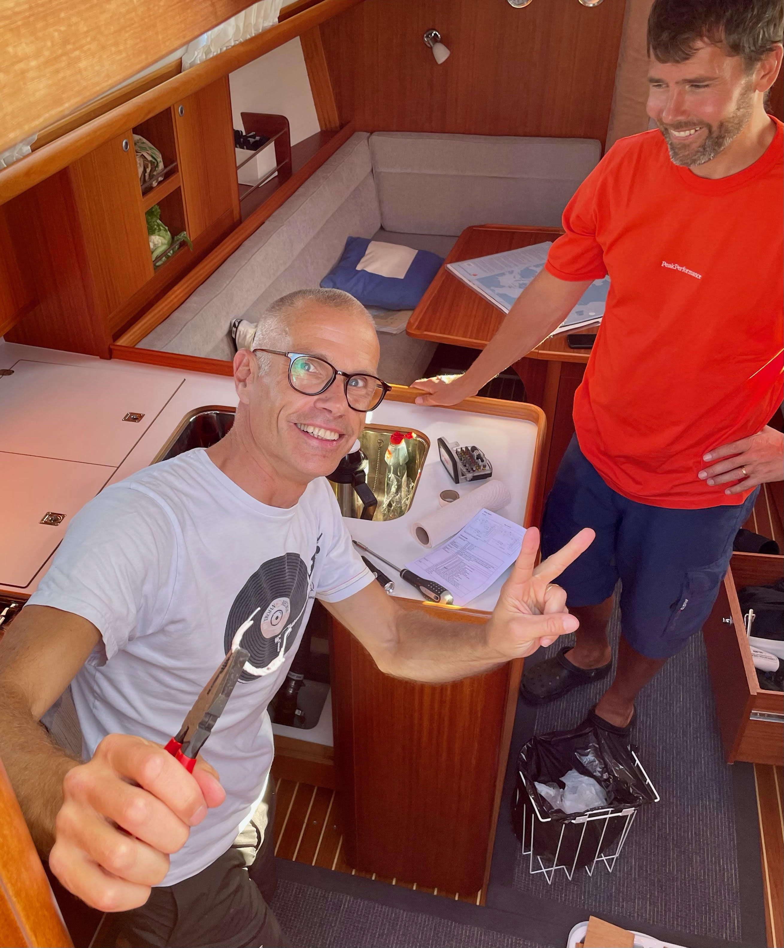 ”Lemon heaven at sunset” är kvällens meny. Och en kall öl till den sedan skepparen med Johans hjälp felsökt och lyckats förbikoppla en trilskande termostat till kylen. Ölen räddad!
