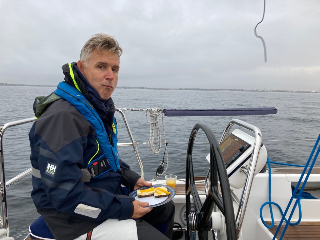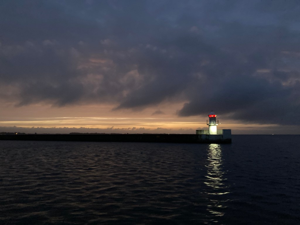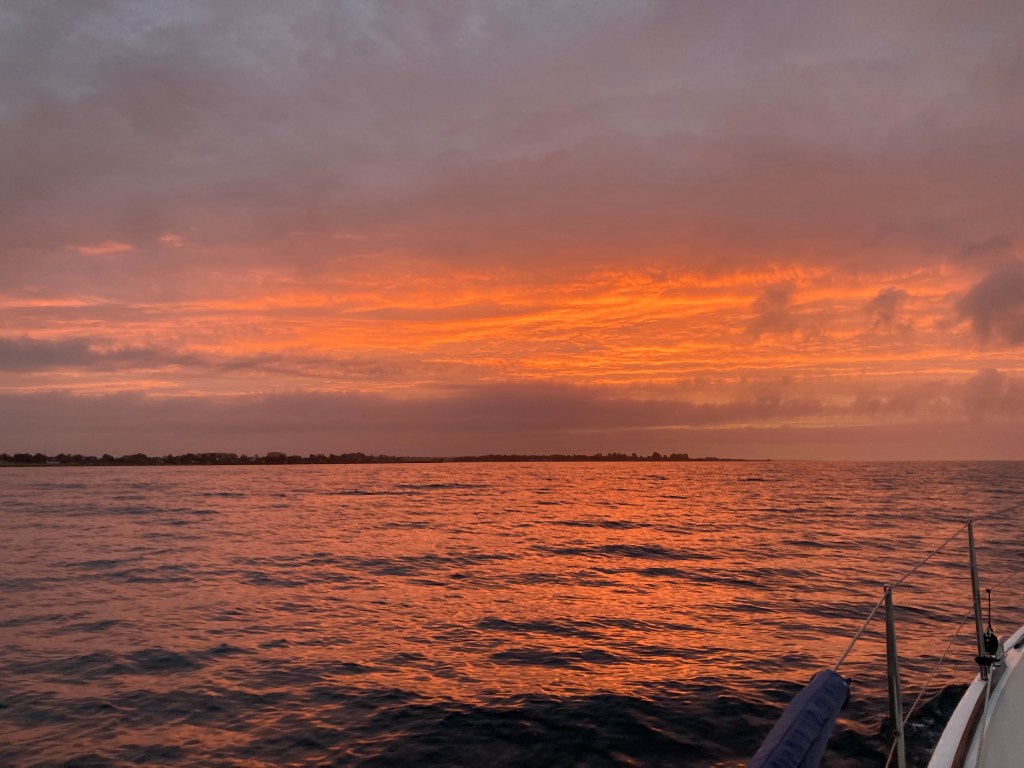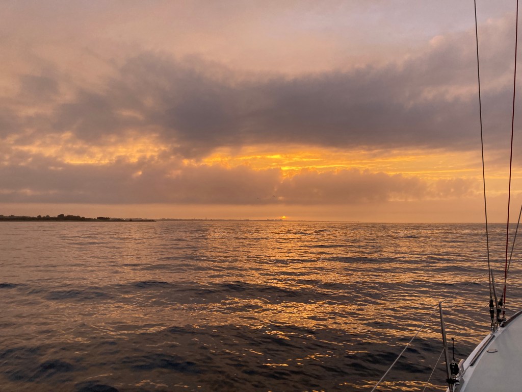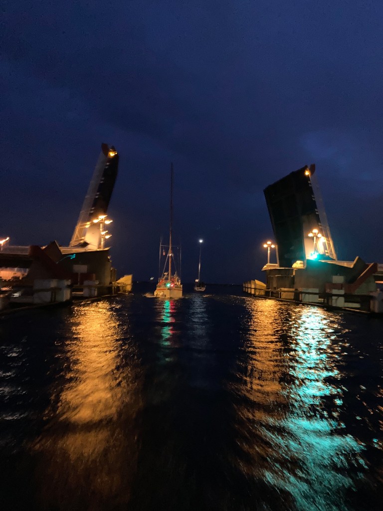 Vi gör loss i all stillsamhet lagom till första broöppningen kl 06.00. En kopp kaffe hinns med före avgång.