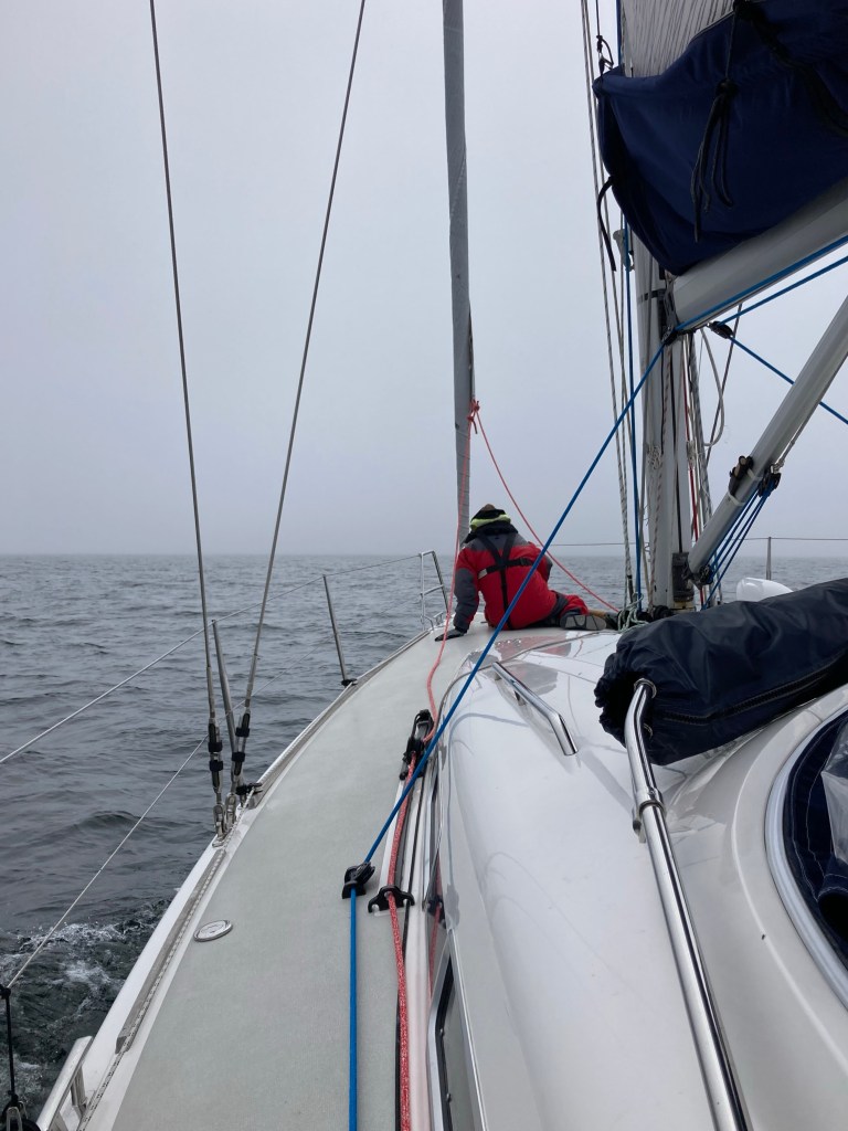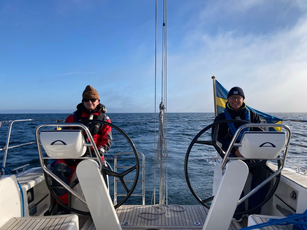 Efter att omgivna av stridsfartyg ha lämnat Karlskrona inlopp slöt sig dimman tät om oss. Vi gick för motor längs Blekinges skärgård mot vinden. Vind och dimma – en riktigt udda kombo. När vi rundade Utlängan så satte vi segel och hade go fart i båten med en SO vind på 5 m/s. Tjockan låg dock kvar och det var som att segla i en säck. Lite läskigt när en motorbåt som inte hade AES dök upp 30 meter framför oss. Vi fortsatte tappert i Kalmarsund och när vinden mojnade fick det bli järngenua i ett par timmar. Vid 5 rycket tilltog vinden igen och vi satte segel och dimman lättade äntligen. Pappa utbrister ”kolla Öland och rapsfälten”. Skönt att kunna njuta av omgivningarna igen. Med en tilltagande vind på cirka 6 m/s så får vi också fullt tryck i ställen och loggar mellan 6 till 8 knop. Underbart! Klockan 21.15 lägger vi till i Kalmar efter en händelsefull dag!
