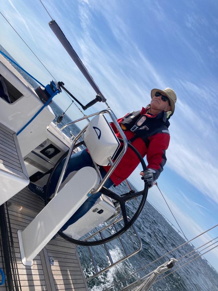 Fortare och fortare gick det, och Håkan klockade 11 knop några gånger. Vinden tog i och plötsligt verkade inte Byxelkrok vara den ideala hamnen längre. Ett snabbt skeppsråd senare girade vi babord och styrde mot Oskarshamn istället. En regnfront närmade sig söderifrån och hotade blöta ner oss ute till sjöss. Regnet väntade dock tills vi lagt till i den inre gästhamnen (kl 16.15, 49 nm) och föll, precis som SMHI förutspått, prick kl 17. På kvällen blev det middag på lokal, Badholmen restaurang.