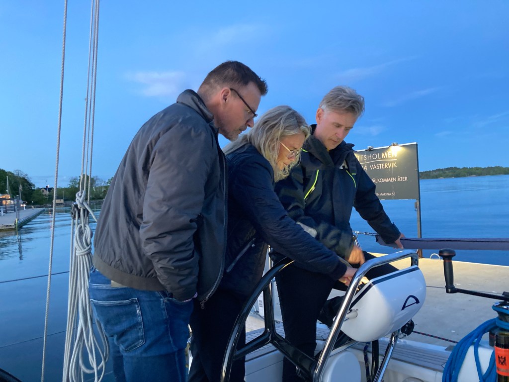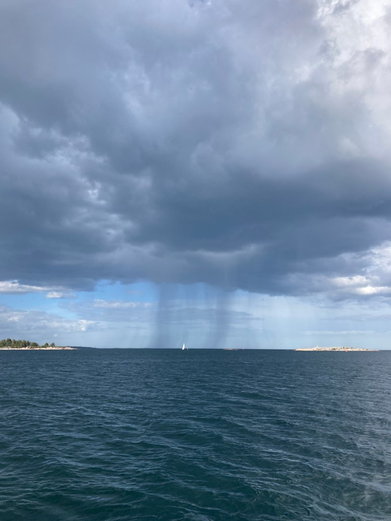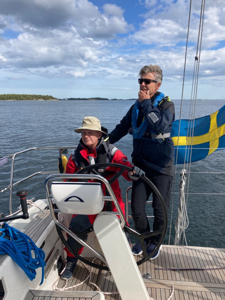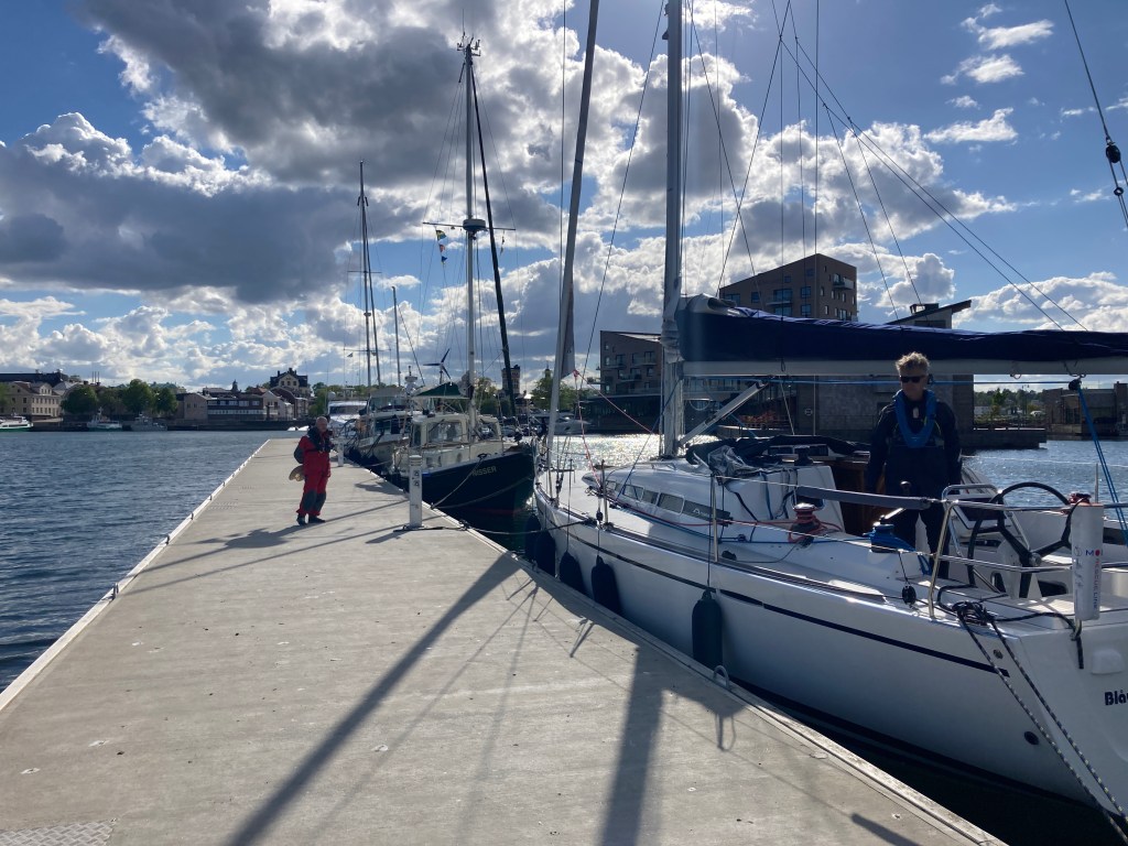 Hela dagen är vi så gott som ensamma på sjön, trots fina vindar och solsken. Vi landar i Västervik kl 17 (ca 40 M), via det smala Spårösundet. Slottsholmen har en ytterplats kvar åt oss, perfekt för den västliga nattvind som väntar. Anki och Jonas, med sommarstuga på Gränsö strax intill, hälsar på.