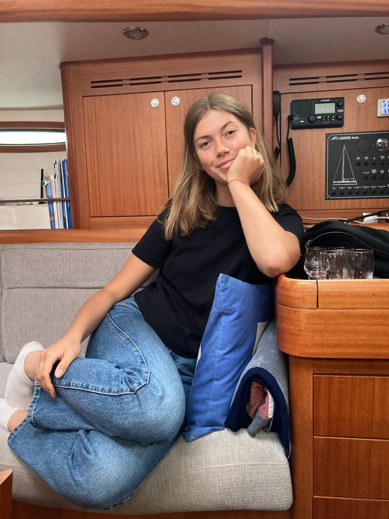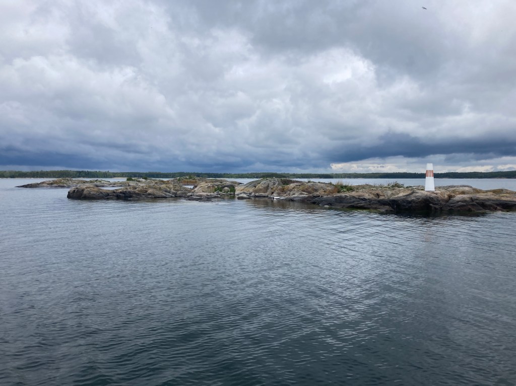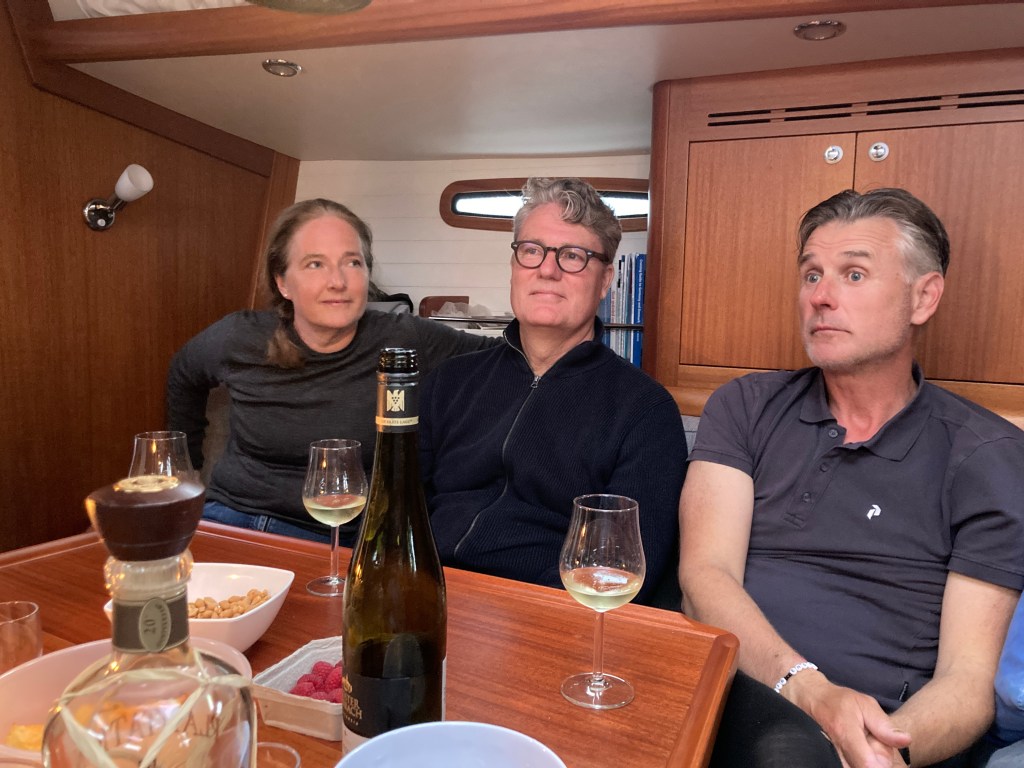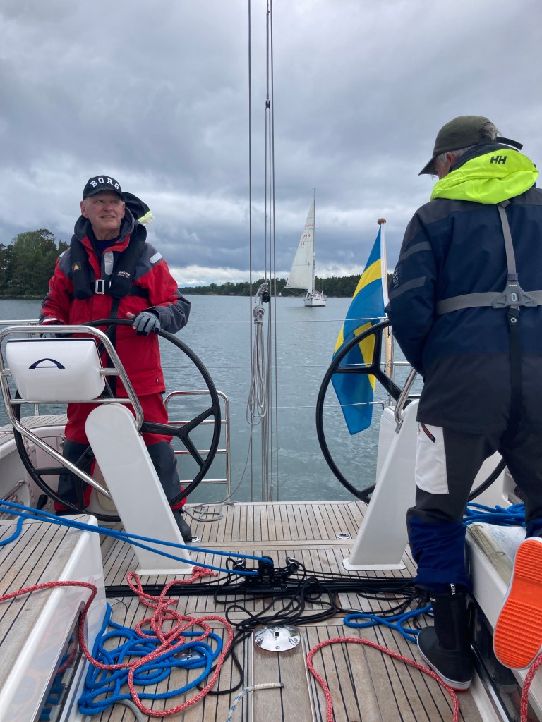 Vi väntade ut nattregnet och valde att gå på den danska prognosen som lovade uppehåll hela dagen. Det skulle vi inte gjort. Vid Aspö öppnade sig himmelen och sen blev det regnsegling hela vägen till Nynäshamn. Men vindarna var fina! Vissa orosmoment fanns, till exempel den retfulla Najaden som smög efter oss i döda vinkeln. Och det blåa snöret som man vippar bommen hit och dit med slet sig under gång, så herrarna fick ligga på däck och pilla med det en stund. Kallt som tusan blev det också, skidvantarna åkte fram. I Nynäshamn mönstrade en gast av (tack och hej Krusse) och två nya mönstrade på (välkomna ombord Elsa och Per). Och finbesök fick vi även här, Kristine och Jesper kom ner med en påse chips och spred glädje.