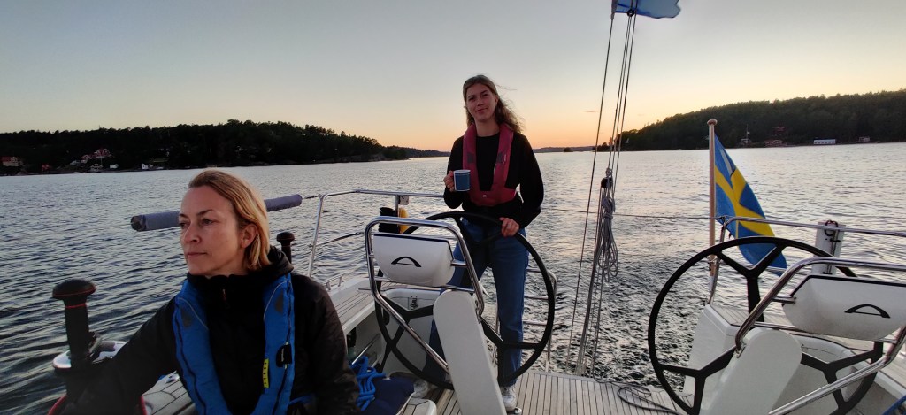 Vi förberedde familjen och Blåvinge för midsommarfirande och det tog en liten stund att komma iväg. Vi kryssade över baggen när solen sjönk i norr.