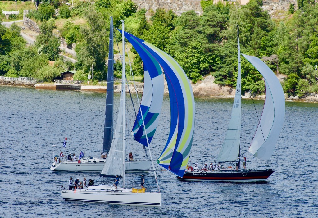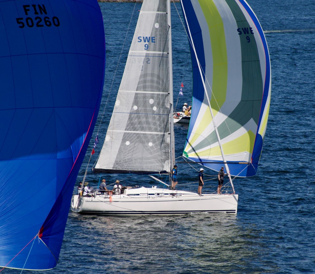 För oss som satt på läktarn (vid Skuru-udden) var det en mäktig upplevelse att se hela Gotland Runt-flottan komma farande med vinden i baken och spinnakers i kulörta färger.
