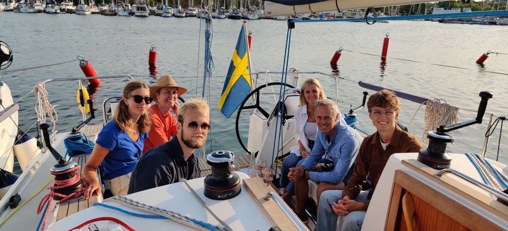 Efter fördrink i båten tar vi en bättre middag på Kroken. Först framåt skymningen lättar Blåvinge igen för kvällssegling mot okänt mål. Sjöbrisen hade inte gett upp utan vi strävar på ut på Mysingen en stund innan vi girar mot Lacka, NSS klubbholme. Lägger till med kvällsbad och whiskey.