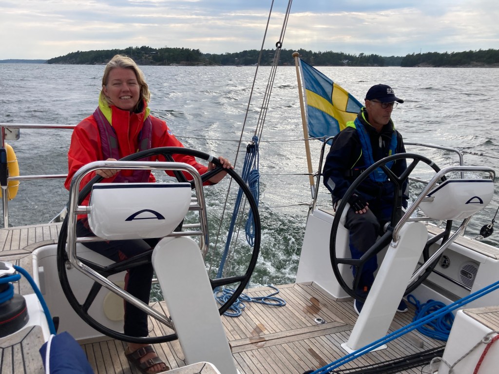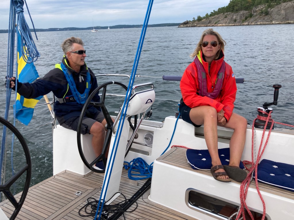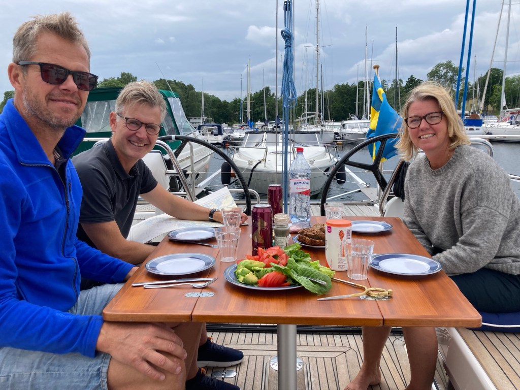 Idag måndag 25 juli 2022 gick Lotta och Janne Frisk samt Kristina och Johan Lembre ombord, taggade till tusen. Lotta hävdade att hon aldrig seglat förr men sedan kryper det fram att hon minsann deltagit (med begränsad framgång men ändå) i jollerejset Sörfjärdsregattan 1980 samt vindsurfat i Eilat 1982. Gedigen erfarenhet alltså och hon sattes i hårt arbete omedelbart, vid vinschar och roder. Sydliga vindar tog oss norrut till Lådna, där vi la oss för ankar i Horsslangen. Regnat hängde i luften hela dagen och började falla när vi lagt oss till ro. Skön dag på sjön och sköna samtal under kvällen.