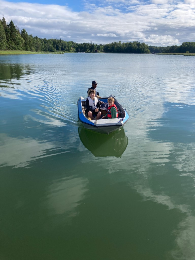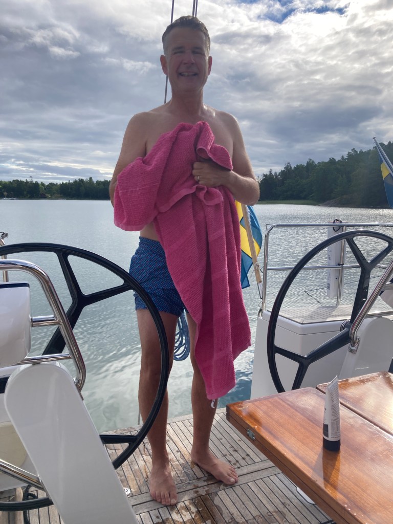 Det var så gosigt i sittbrunnen denna morgon att vi knappt ville ge oss av. Till och med Janne badade. Dessutom kom några välartade ungdomar med hembakt bröd, vilket ytterligare förhöjde känslan av välbefinnande.