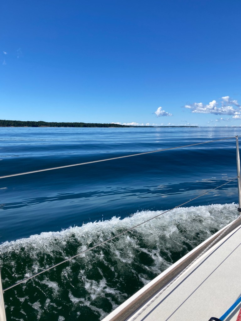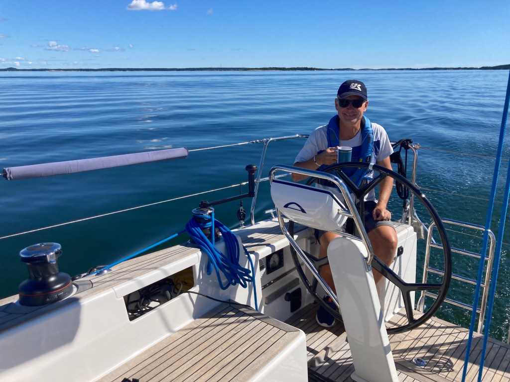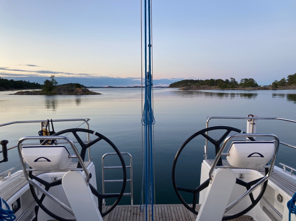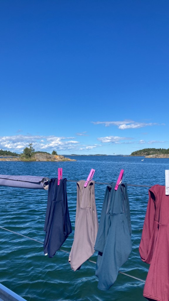 Vi tuffade från Utö i bleke och gick söderut. Efter ett tag kom en bris och förseglet rullades ut. Gick fint med bara förseglet ett tag men sen blekte det ur igen och motorn drogs igång. I fladen mellan Lindskär och Bredarön la vi oss på svaj och tillbringade hela eftermiddagen och kvällen med klädtvätt, läsning, virkning, matlagning, nakenbad och sommarpratslyssning (Lydia Sandberg och Sverker Sörlin kan rekommenderas) – alldeles ljuvligt!