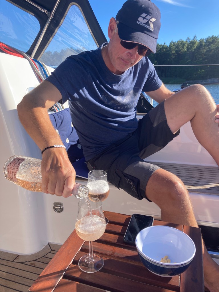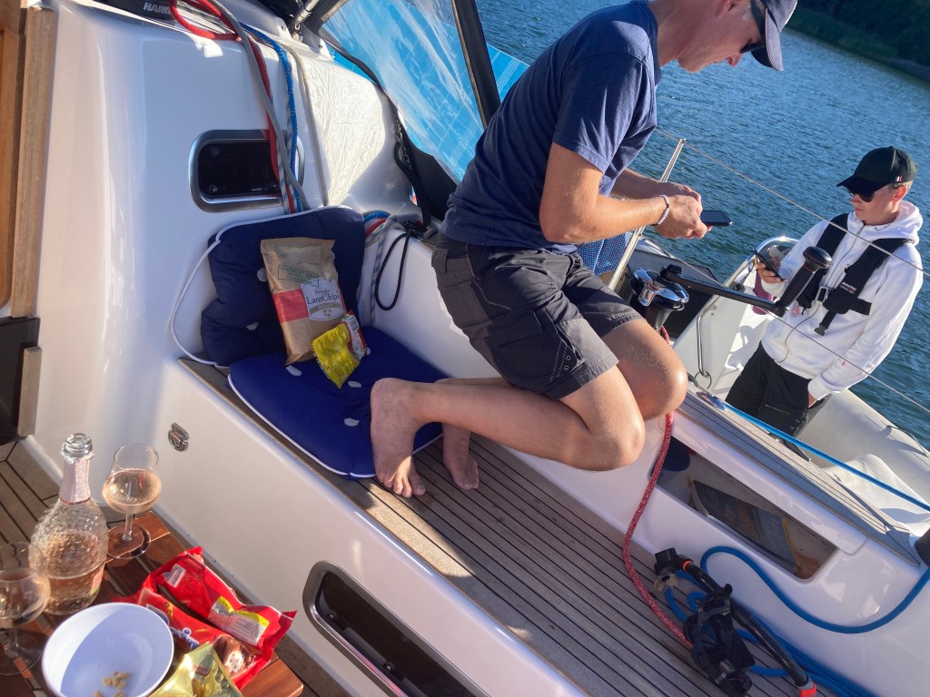Ett syfte med att gå till Trosa var att proviantera och det blev det ju som bekant inget med. Men dra på trissor, en liten båt kom till vår vik, saluförandes livets nödtorft chips, godis, glass och varmrökt lax. Vi kommer lätt att överleva ett dygn till.