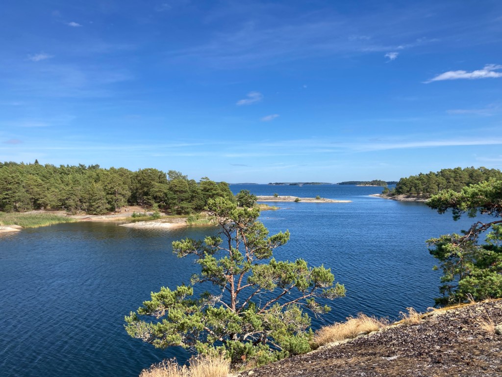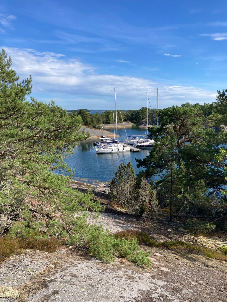 Vi startade tidigt, före kl 8.00. I början hade vi en stillsam undanvindssegling på Nämndös och Runmarös utsidor och sedan ökade vinden, så vi kom fram till Finnhamn redan vid tvåtiden. Här hade vi förra veckan spanat in en brygga vid berghällarna som vi gärna ville pröva. Så tidigt på dagen var det gott om plats och vi fick hjälp av storbåtsägarna att lägga till. Det var varmt idag och bad nödvändigt. Och en vandring runt den lilla fina ön Söder-Långholm.