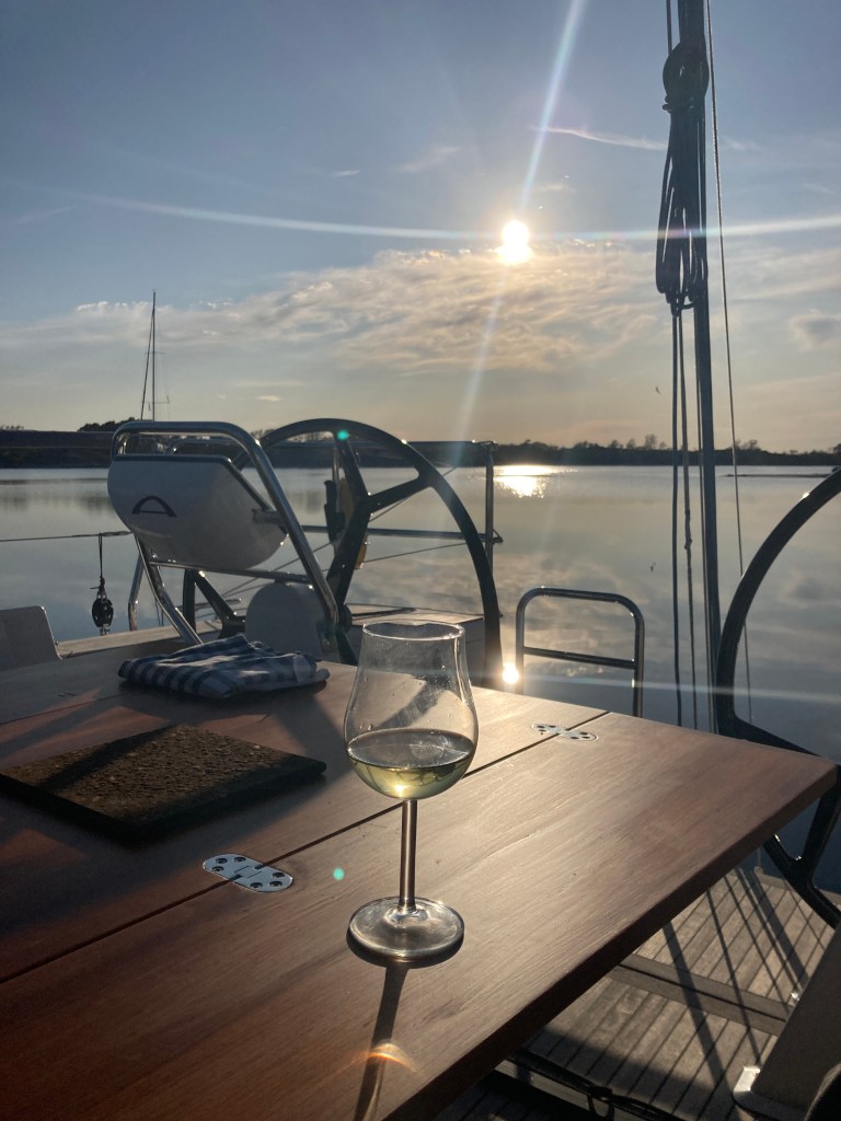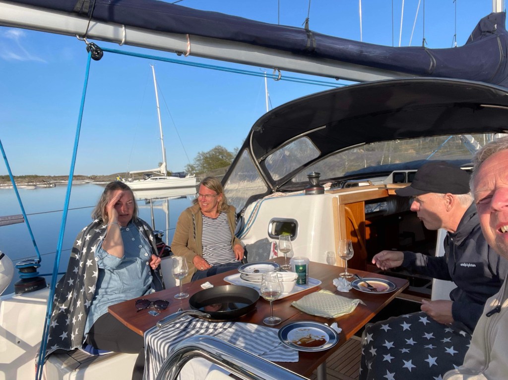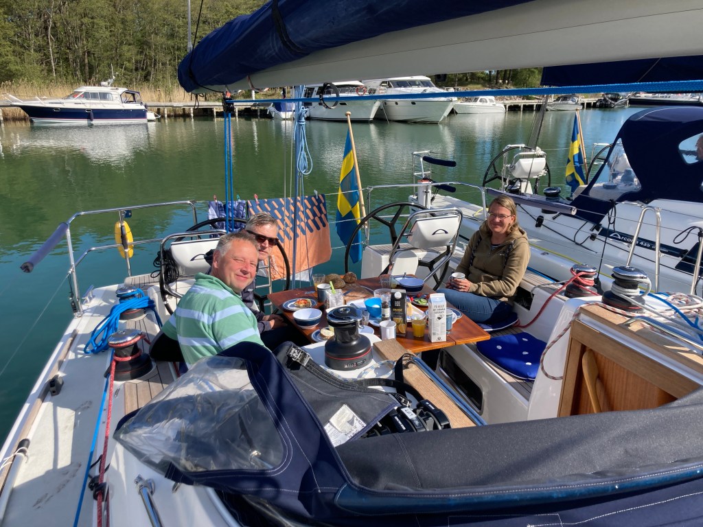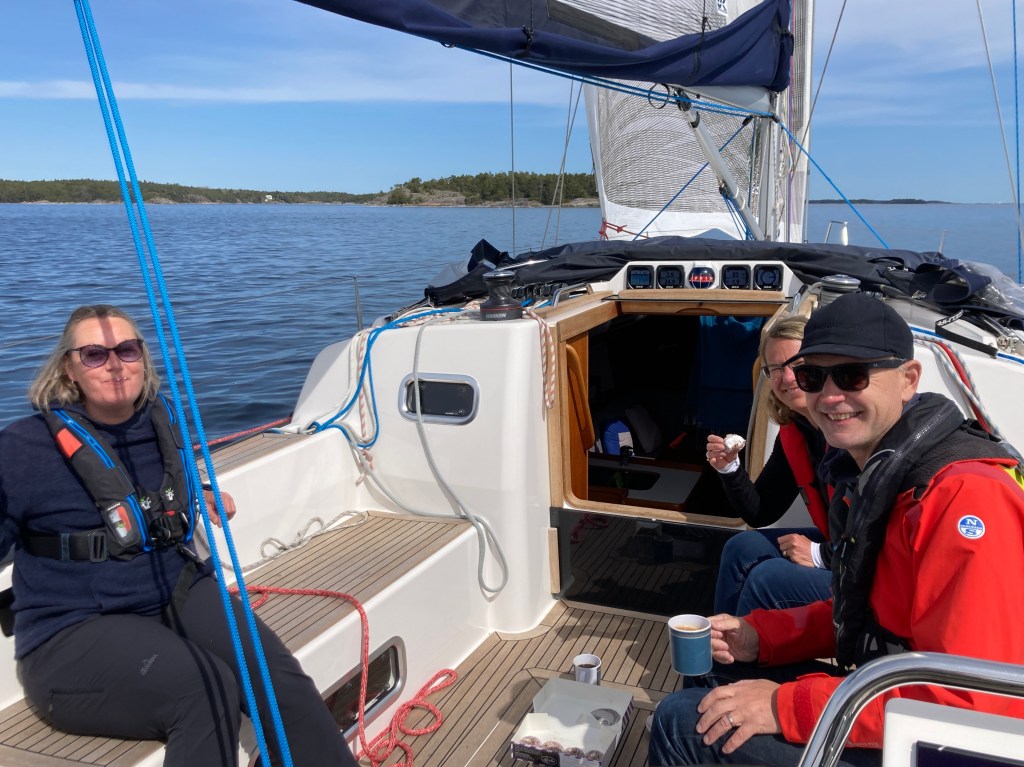 Efter en stund blekte det nästan ur men Blåvinge gled tyst och fint vidare mellan skären öster om Ornö. Kaffe med gräddbulle satt fint.