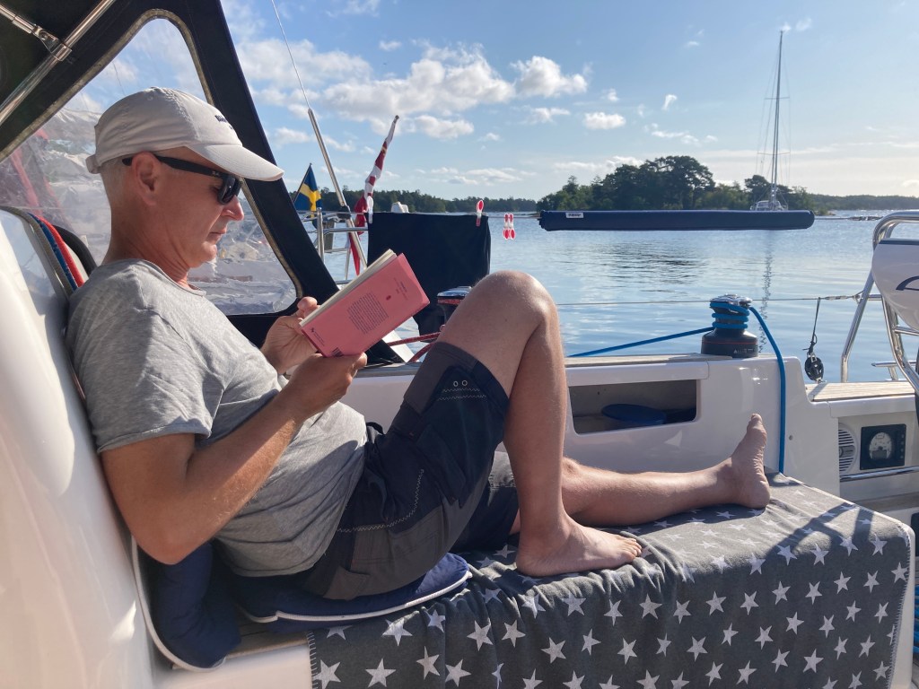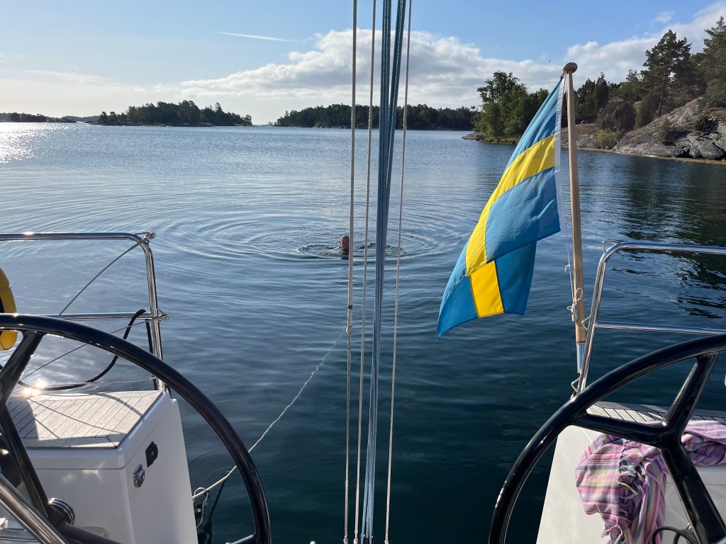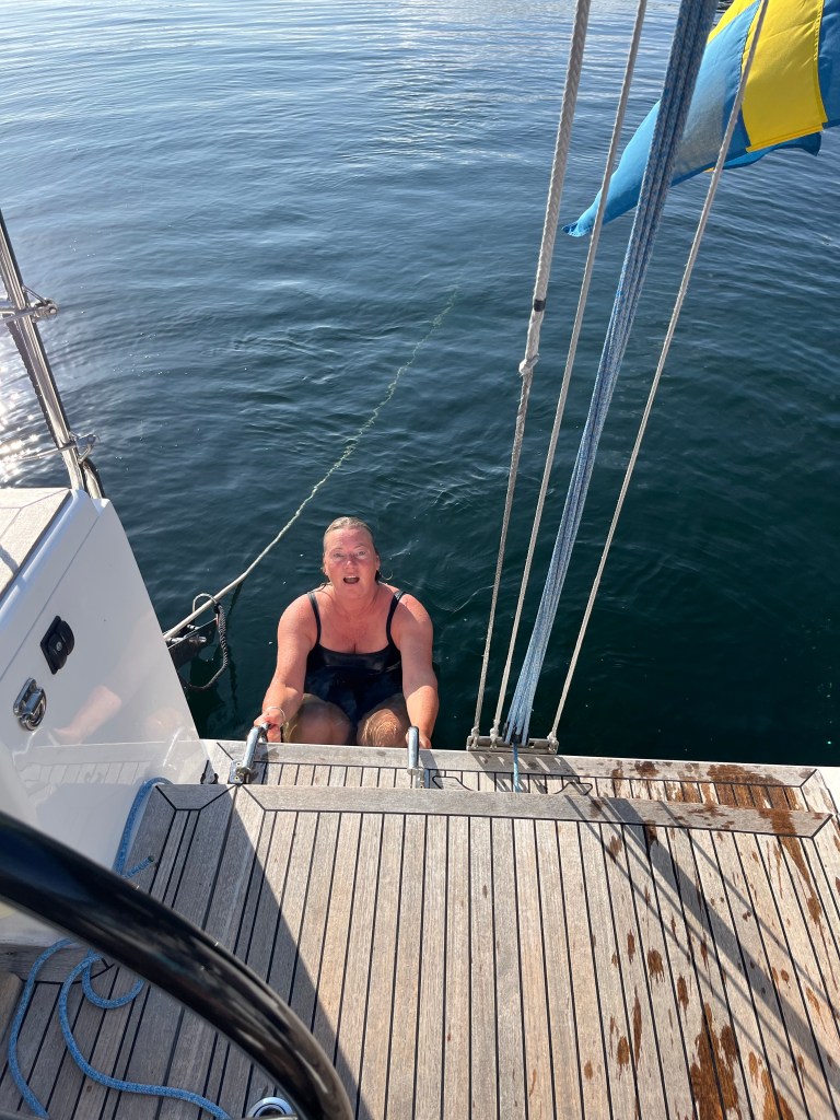 Morgondopp i solsken. Enligt grannbåten är det 14 grader i vattnet. Hade varit bättre att inte veta…
