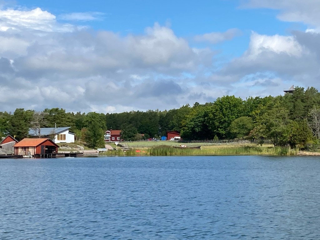 Fredag morgon tar vi oss ut på fjärden och får se solen. Efterlängtat. Vi har använt vartenda vind- och regnplagg i båten och ser nu en chans att torka upp dem.