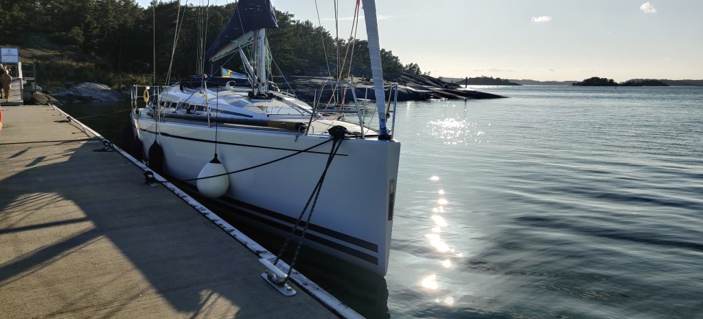 Vi brusade fram genom Stockholms södra skärgård. Vinden stadigt 6-8 från aktern. Efter ett litet sök hittar vi fram till nya (nåja) KSSS hamnen på Telegrafholmen. Super!
