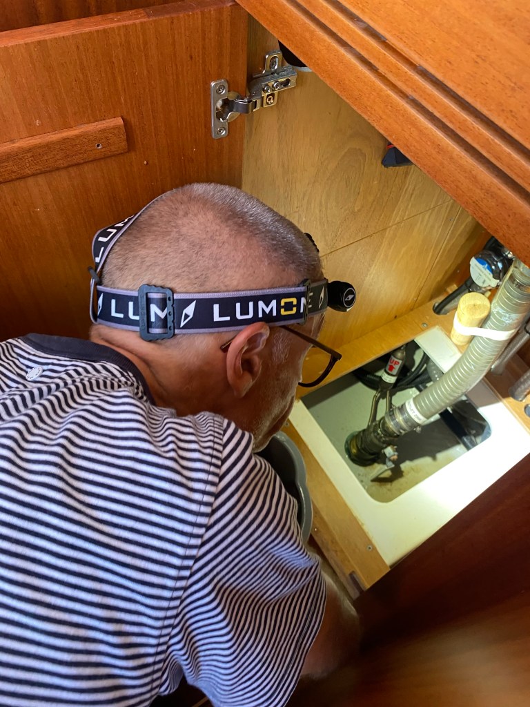 Skepparen söker orsak till läckage. Kan det vara sjöintaget till toaletten? Motorkylningen? Visar sig vara ventilen till diskhon som läcker.