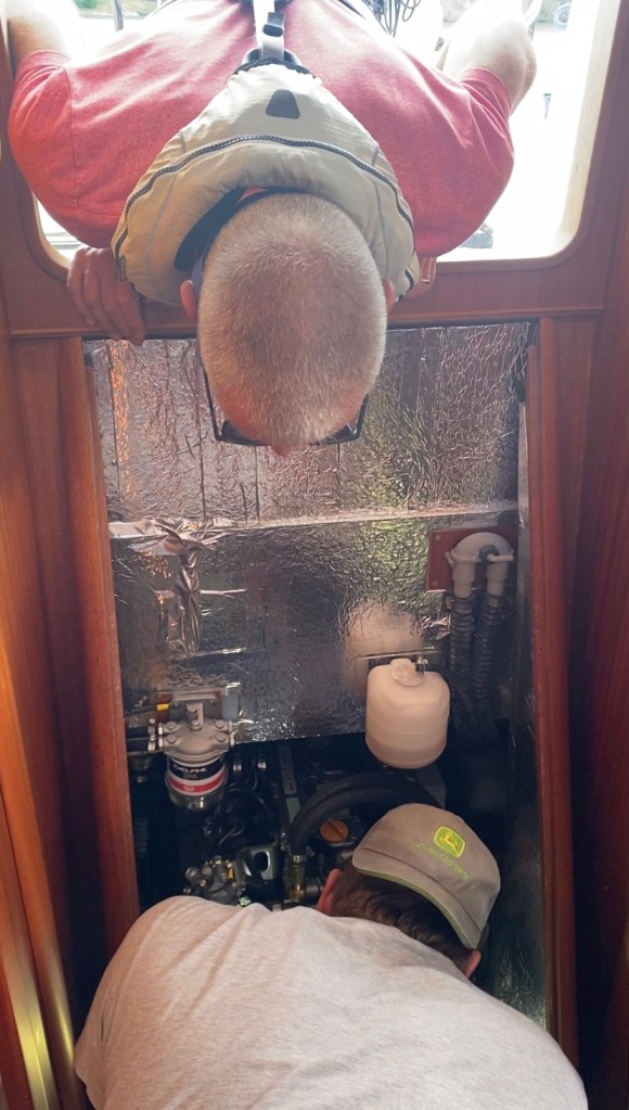 Med proffsmeckare ombord passar vi på att felsöka läckage. Och jodå, nog fann vi källan. Trilskande impeller!
