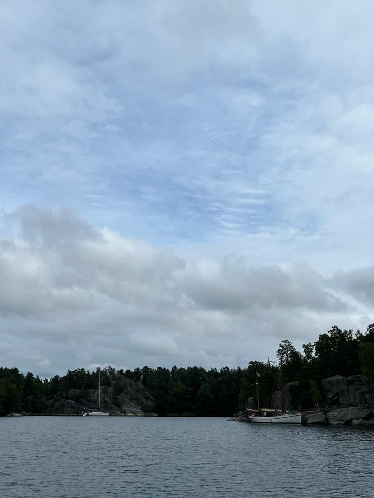 Viken välkomnade oss med flera båtar utspridda, somliga längs landknutar, andra för ankar. Vi söker en yta som Blåvinge kan svänga runt på utan att slå i de som redan är på plats. Helt lugnt och båtarna guppar lite åt alla håll. Har vi kommit närmare den där Bamsen? Nu ligger 50fots-Hallberg Rassyn närmare, eller? Det fick bli ett omtag. Däcksbelysning och ankarlanterna får jobba i augustinatten