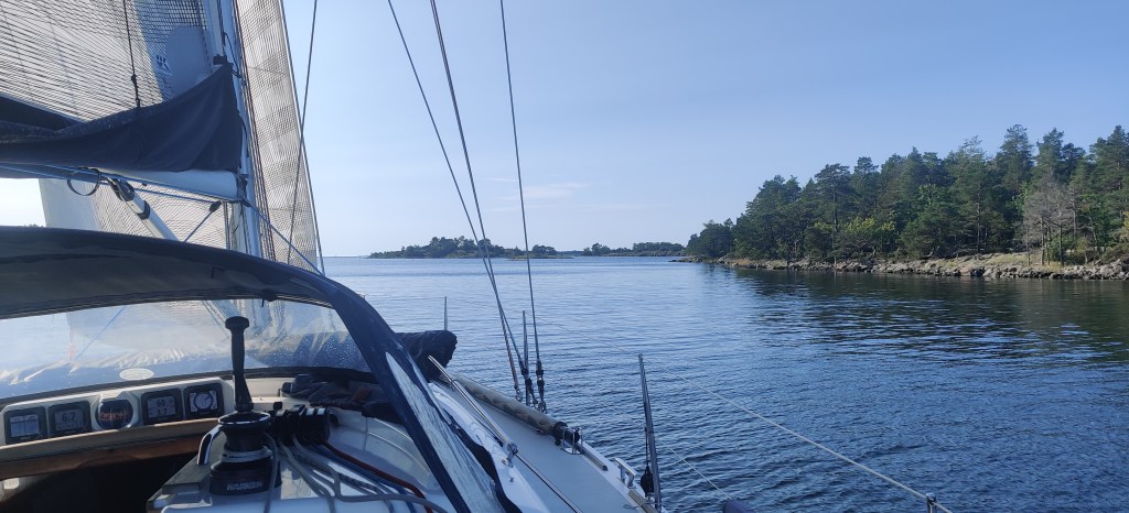 Glider igenom skärgården och sedan ned mot Blå Ljungfrun. Sol och 6-8 m/s med öppen bidevind och 8 knop. Vi justerar in loggen för att få analog visning med minimal dämpning och en nödvändig om än något trist kalibrering nedåt för att matcha SOG data bättre.