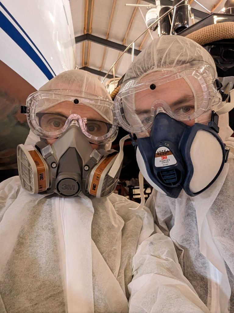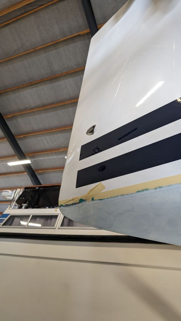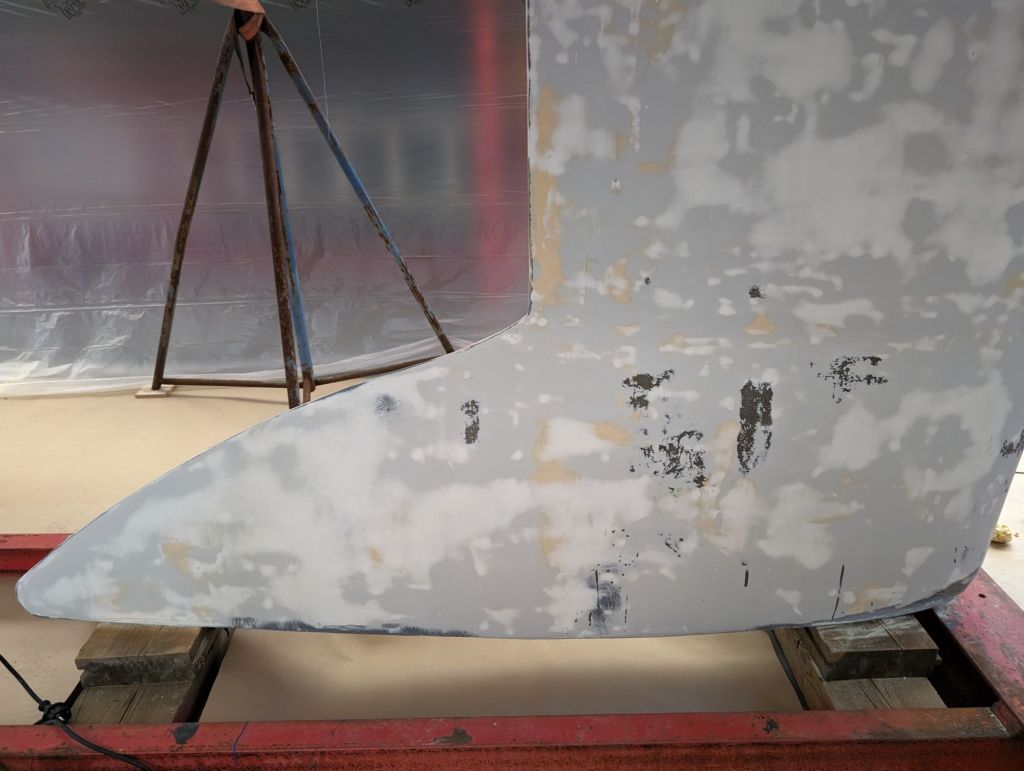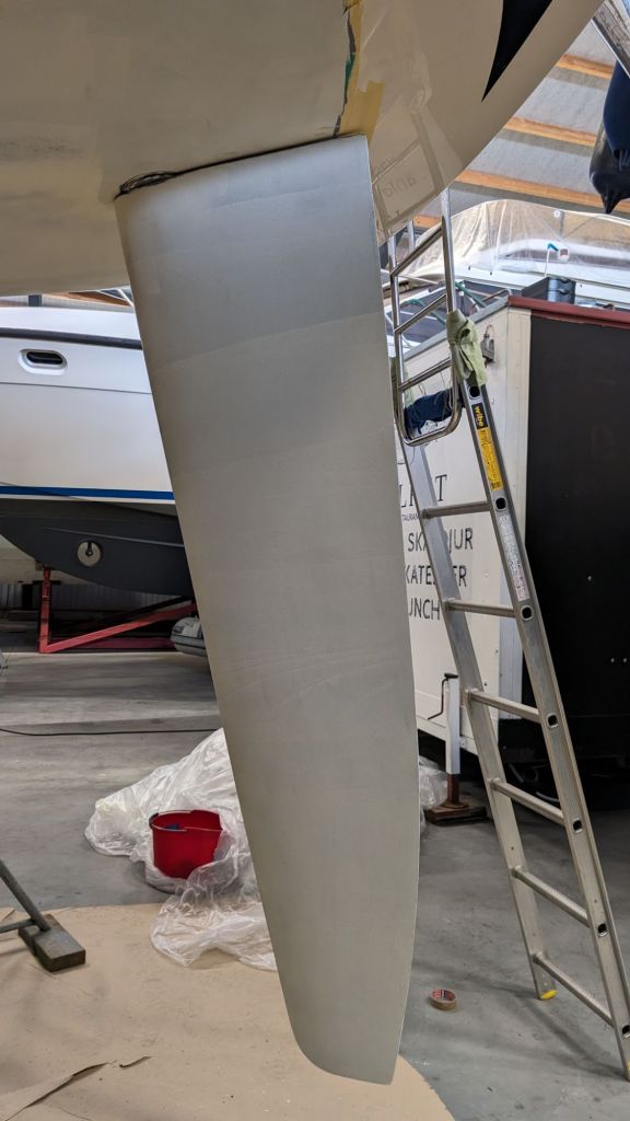 Det har slipats rejält av varvspersonalen så vi kom till ett dukat bord. Bara att måla, måla, måla. Lager på lager och lite justeringsslip och sedan flera lager. Stötta av och stötta på. Gasmasker och overaller och ömma leder och värkande ryggar. Som det ska!