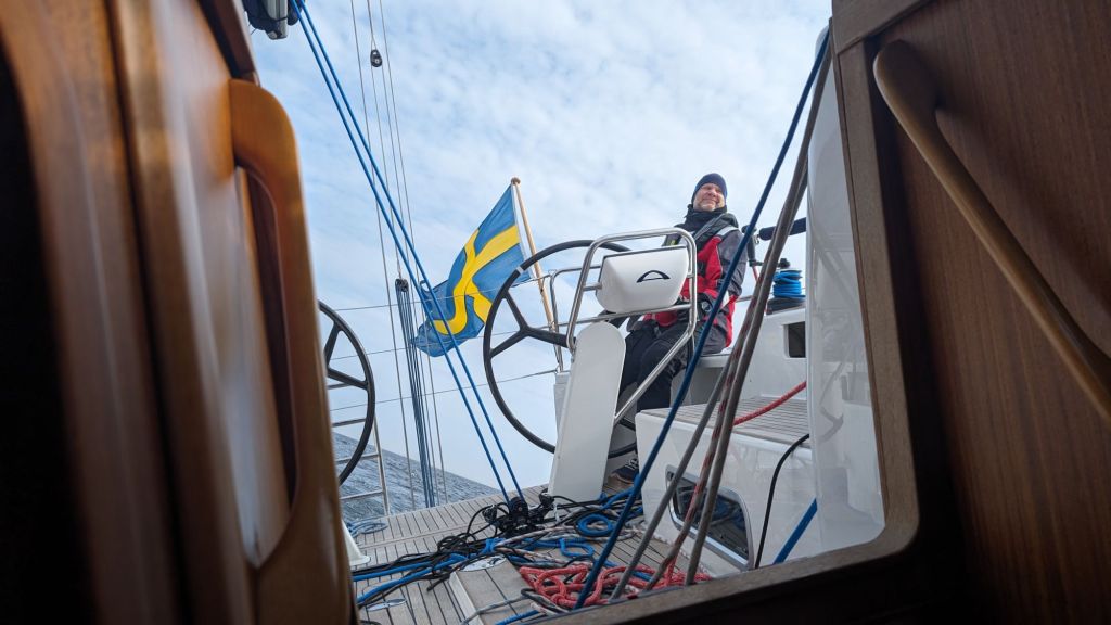 Nu stävar vi på med 8 m/s, ett rev och den svarta får visa prov. Måttlig sjö tackar vi för. Det ska mojna senare så njuter av vindarna nu.