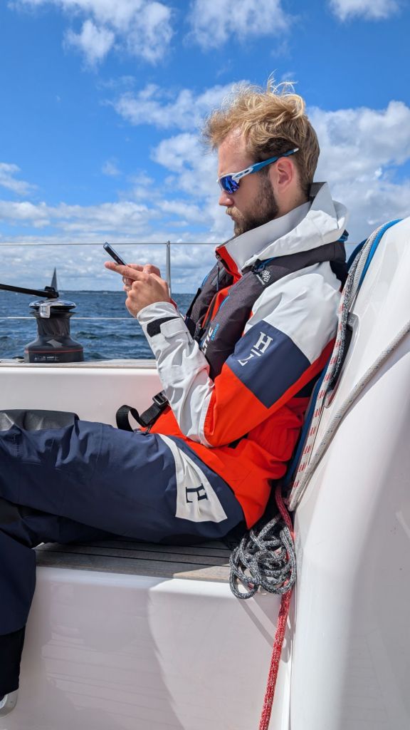 Med solen i håret (i alla fall emellanåt) och vinden i ryggen (främst) seglar vi ikapp båt efter båt upp genom sundet. Lunchen intages under gång och alldeles för snart kom vi fram till Helsingör så vi gick vidare. Toppar 10 knop på gps så en hel del ström norr om sundet. Skönt att vi inte kryssade åt andra hållet.