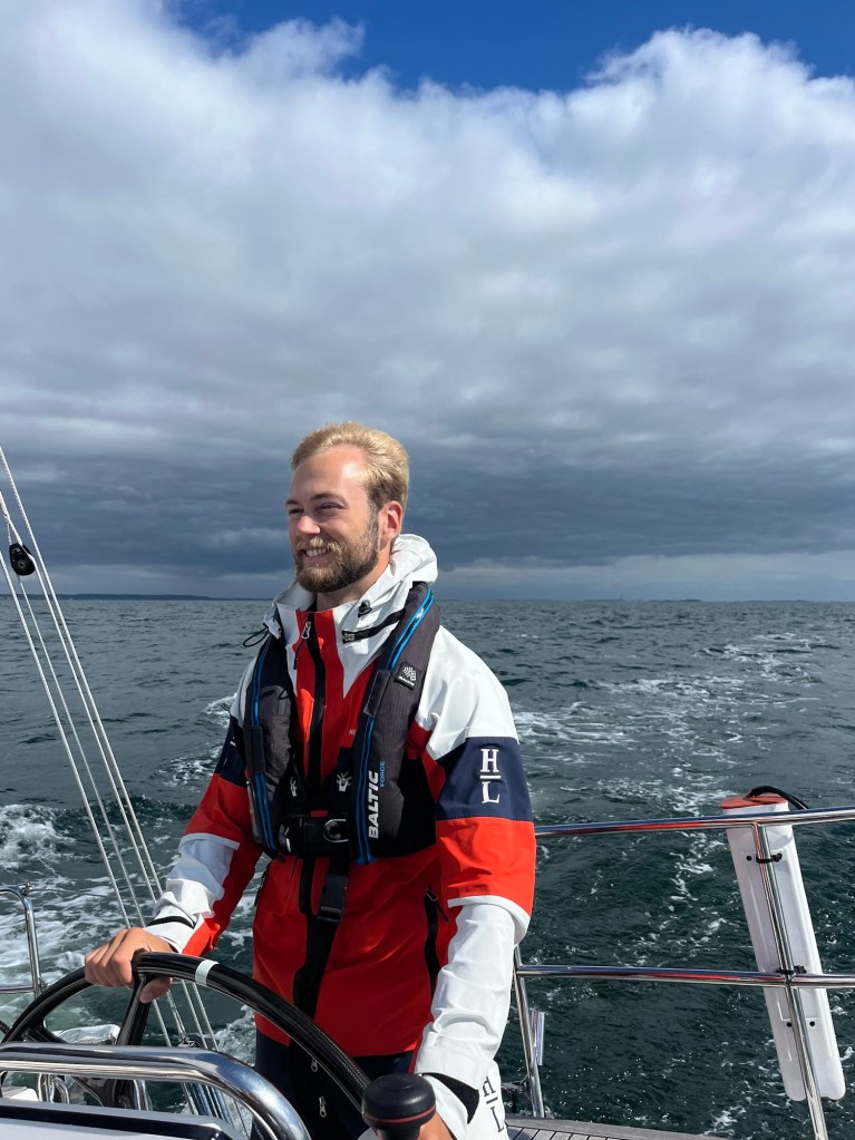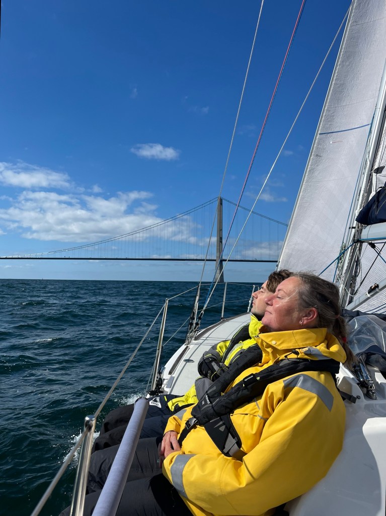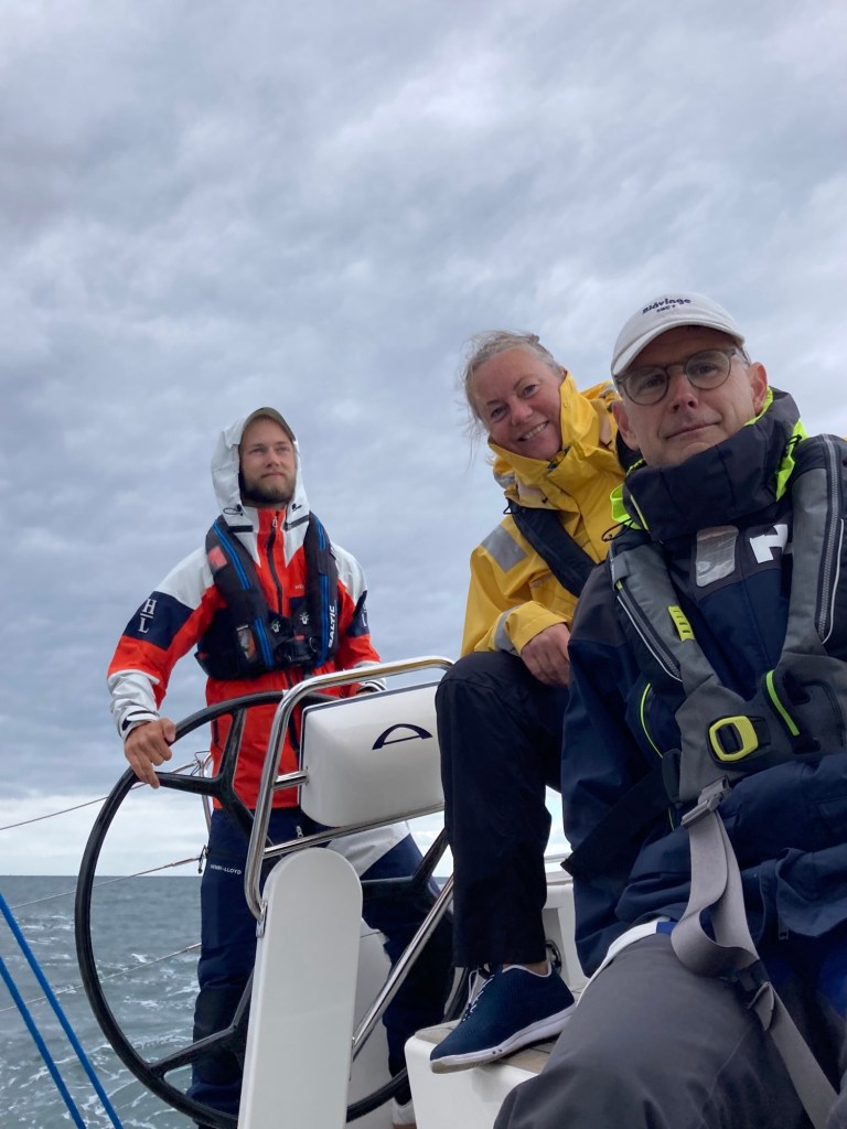 Malmölembres segellevnadsregel nr 1, starta aldrig i regn, trädde i kraft denna morgon. Det blev både sovmorgon, frukost, läsning, lyssning, virkning, joggning och lunch innan havet och vinden slutligen kallade på Blåvinge. Loss strax efter kl 14 backade vi oss försiktigt ut ur den trånga hamnen och sedan blev det åka av. 10m/s från NV och rejäl sjö hanterades elegant av Nils när vi sträckte mot Stora Bält-bron. Vi startade med rev och det var skönt, mer storsegel behövdes inte denna dag. Gustaf trimmade för glatta livet och tog efter ett par timmar över rodret. Det blev en fin segeldag med lyckliga och väl genomblåsta seglare!