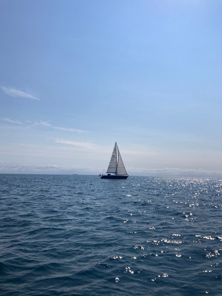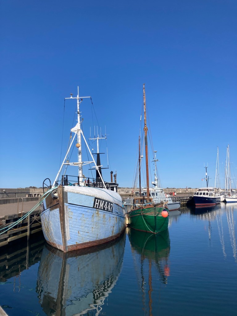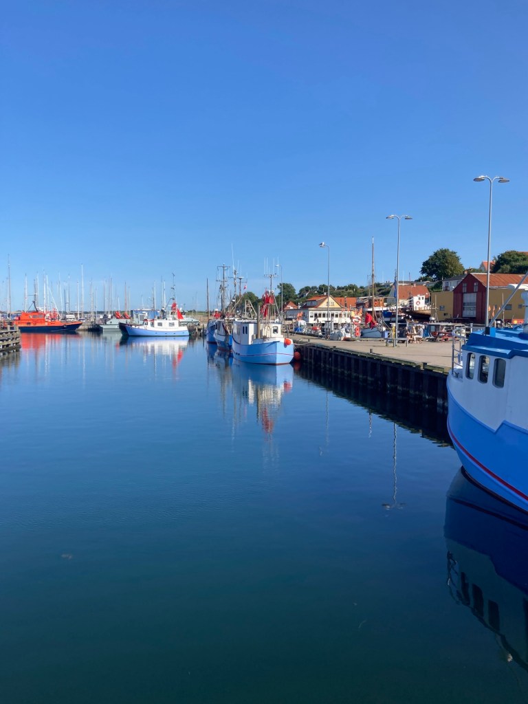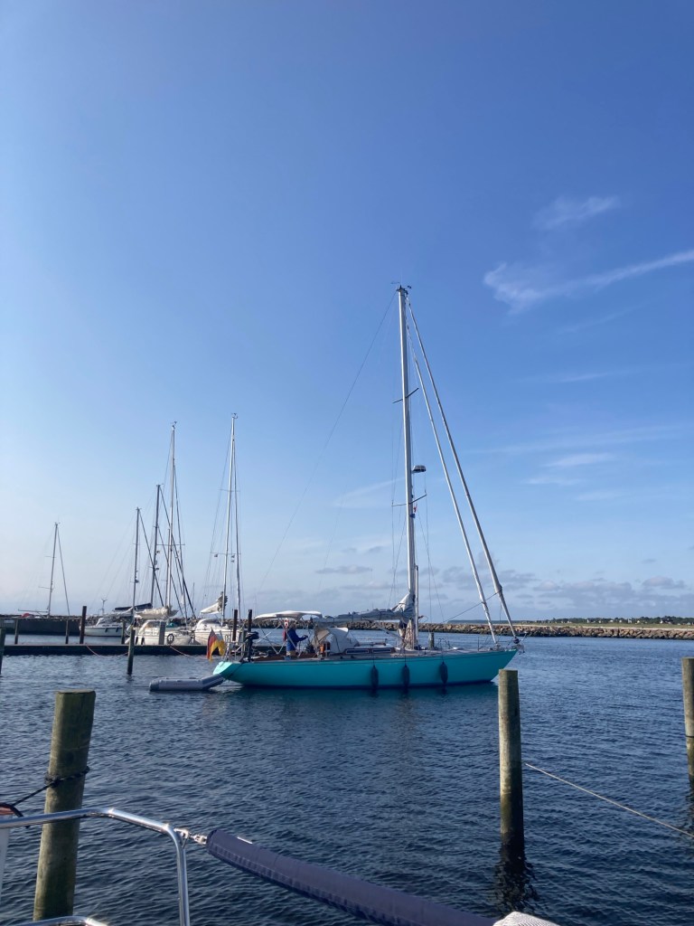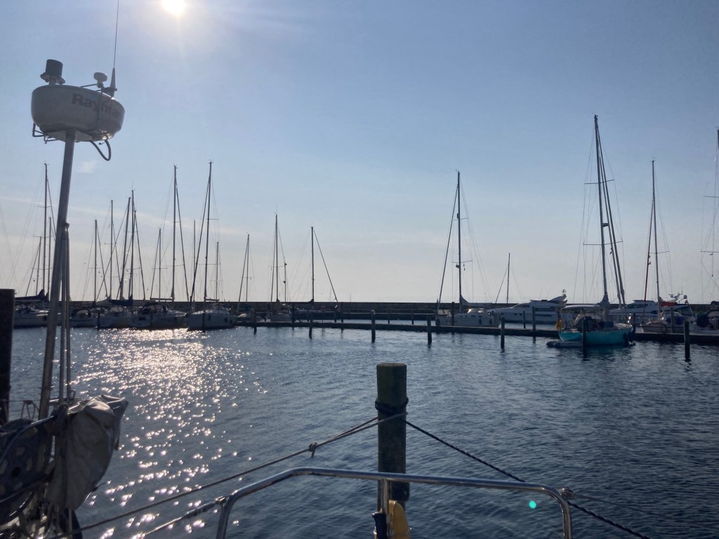 När vi vaknade på morgonen var hamnen i Grenå nästan tom – alla ville nog till Anholt denna soliga dag med västliga vindar. Grenå, som är en välskött och oväntat trevlig liten marina, är för många sista utposten inför överfarten.