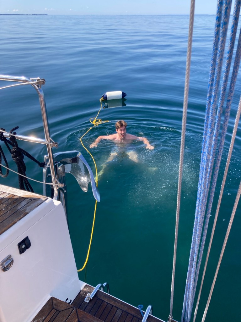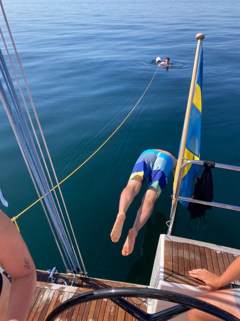 Vi fortsatte att fira långsamhetens lov i svaga vindar denna vackra dag och många dopp blev det. En tumlare följde oss en kort stund. Team Nelson lagade en läcker lunch under gång.
