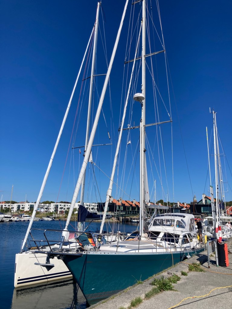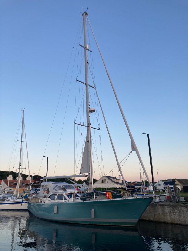 Väl i Ebeltoft lade vi oss i storbåtshamnen, utanför en Nauticat vid namn Mira. Den skulle avgå senare på kvällen för en resa utan slut men med första destination Spanien. Paret ombord hade jobbat intensivt i nästan tre år med båten och hade nu sålt alla landtillhörigheter. Denna kväll skulle de påbörja resan söderut.