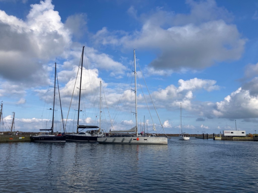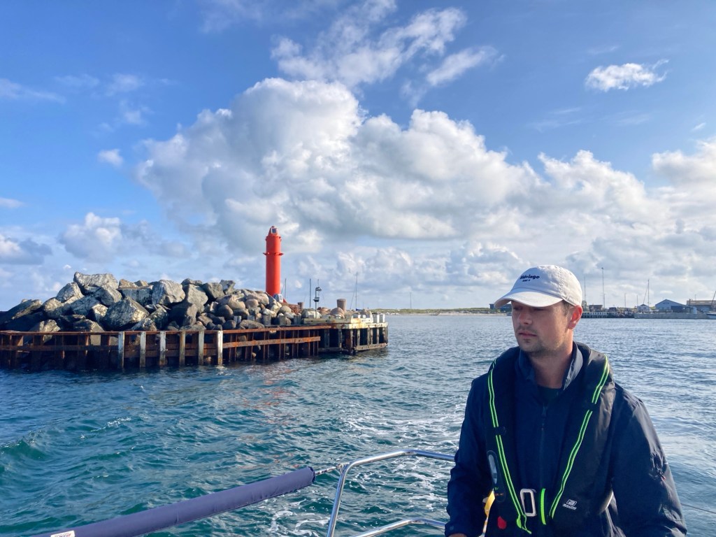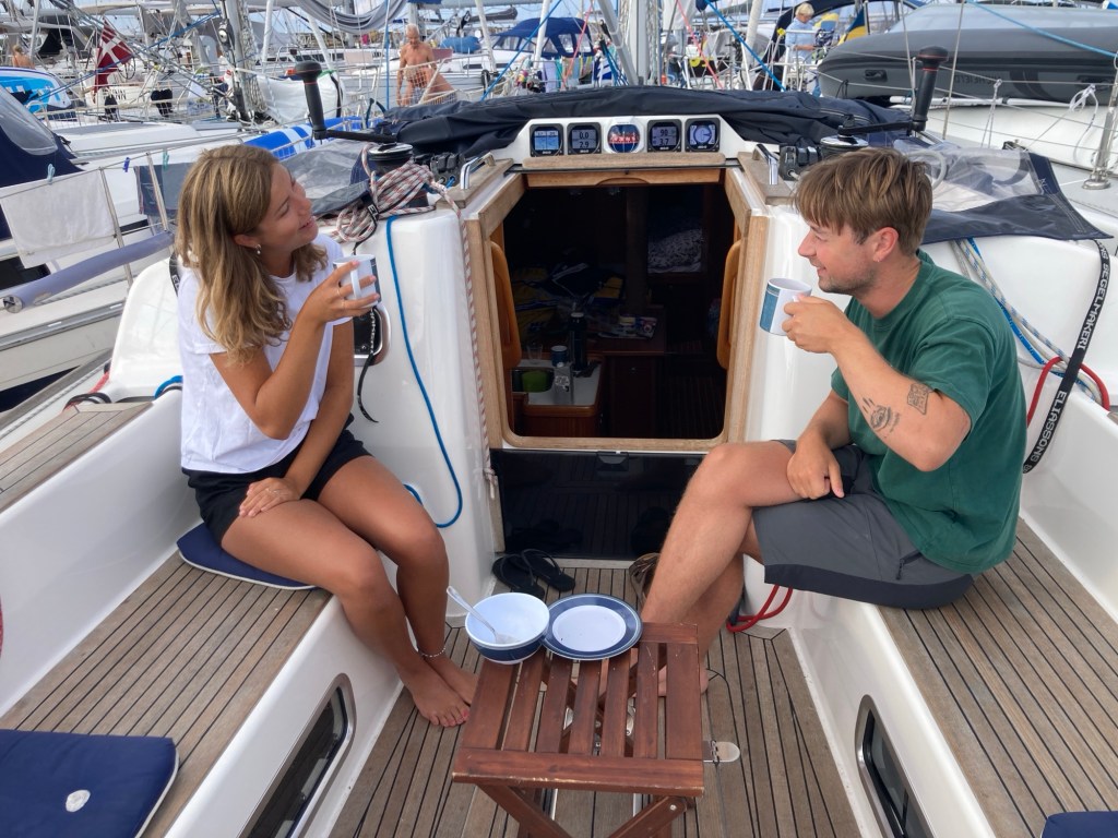 Efter att återigen fyllt kaffetermosen på kaffebaren (”du igen!”) käkade vi som var vakna snabb frukost och gled sedan elegant ut ur hamnen strax före halv nio.