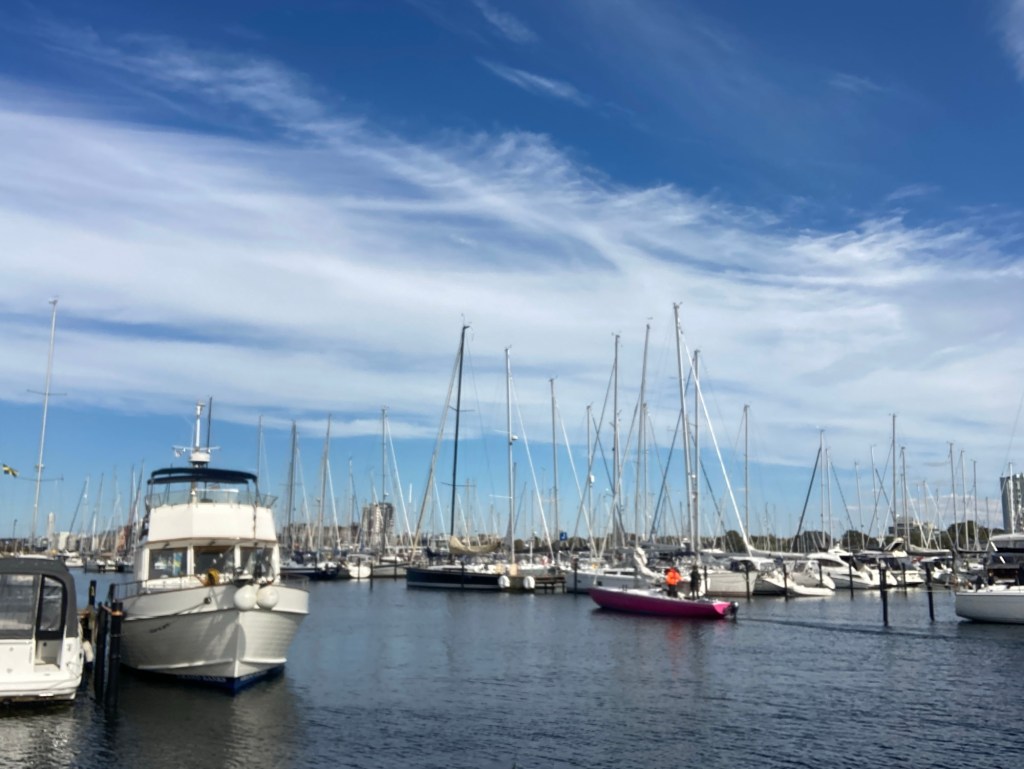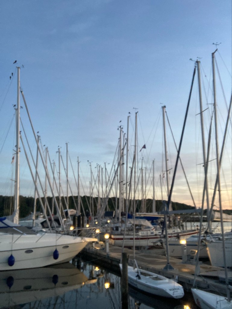 Soluppgång och morgondopp – naket, för så gör man visst i Nivå och man får ju ta seden dit man kommer – följdes av frukost i sittbrunnen. Sommarvärmen höll i sig men inte vinden, det blev segling en timme i början och en stund på slutet, med motorgång däremellan. Tack för en fin helg, Mia och Håkan!