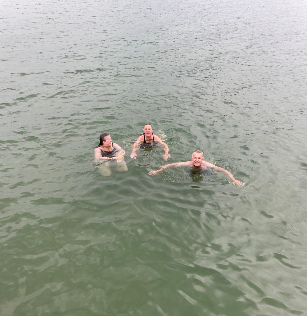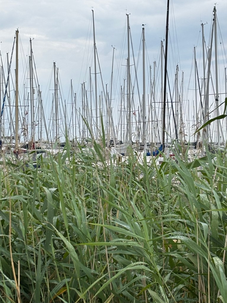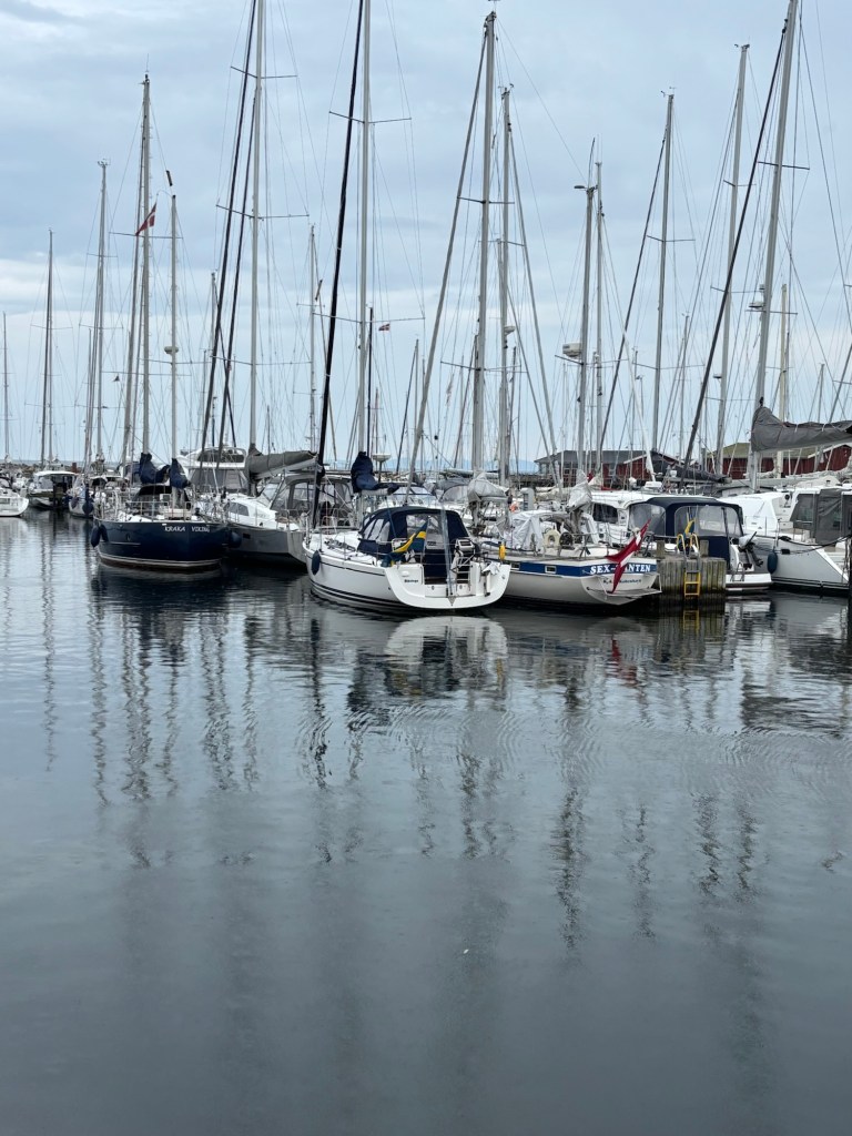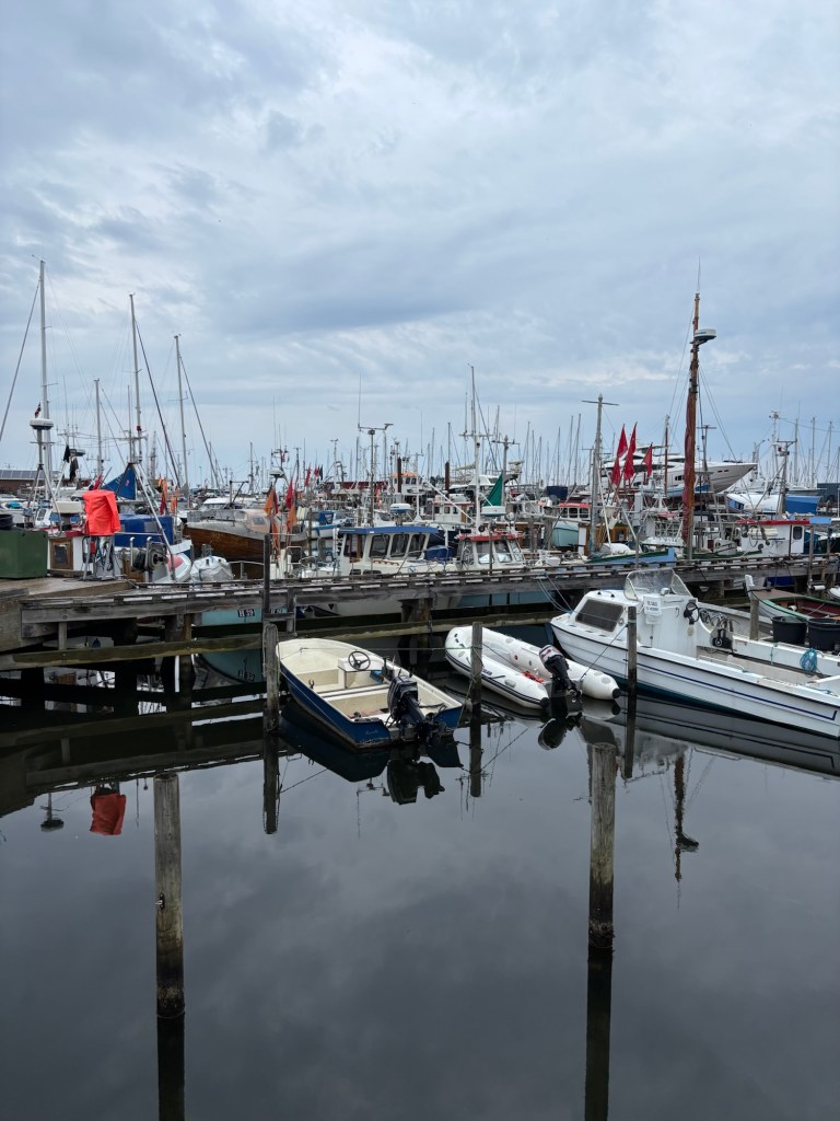 Just när vi lagt till utanpå en dansk Hallberg Rassy kom regnet smattrande. Vi reste sittbrunnstältet och firande tilläggningen med öl, vin och ostar. Sedan blev det bypromenader och hårtvättsbad från bryggan på utsidan piren.