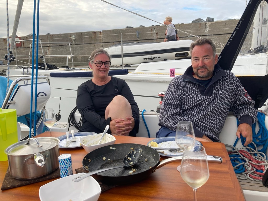 Middagen i sittbrunnen bestod följaktligen av smörstekt torsk, skagenröra och potäter. Samt champagne. Det går ingen nöd på oss.