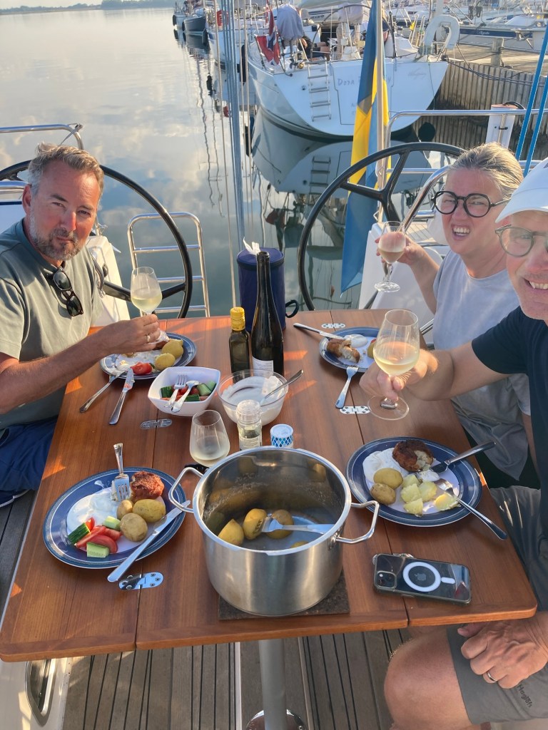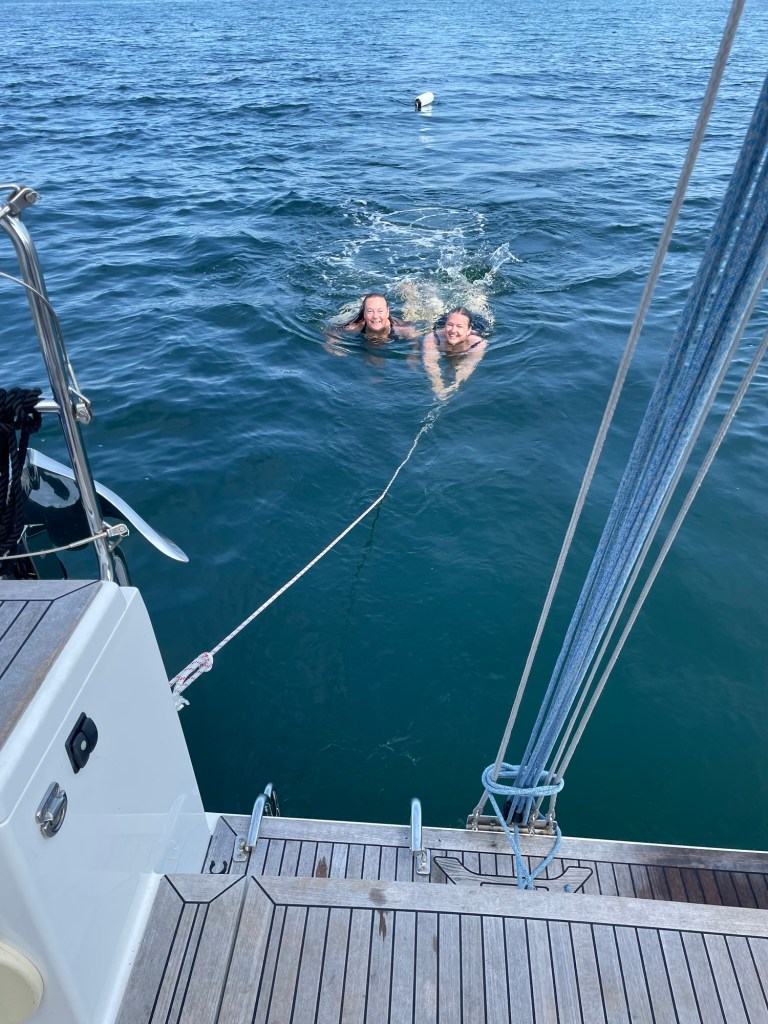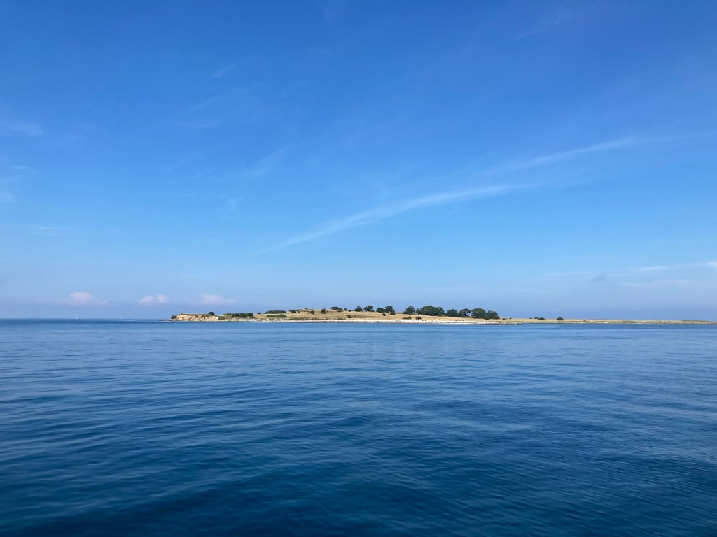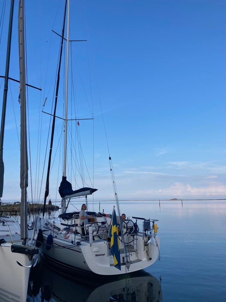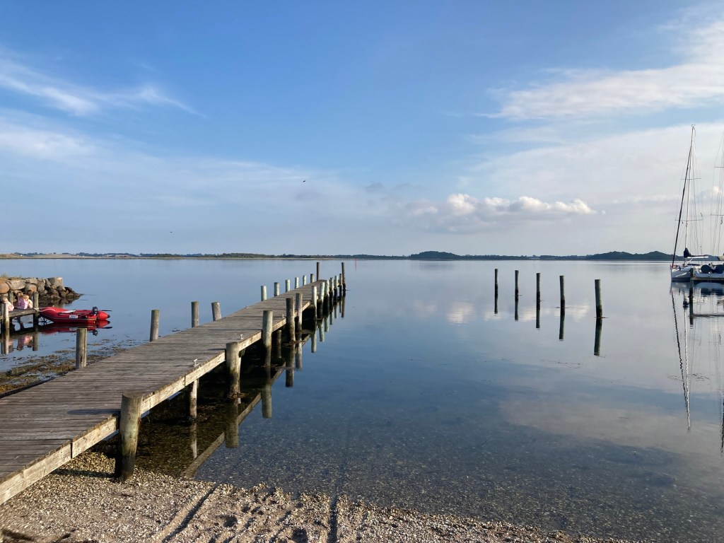 Ja, den här seglingsdagen kommer vi att drömma oss tillbaka till när höststormarna viner. Strålande sol, sköna långsamma vindar, bad efter båten och ja, Annika fick äntligen se tumlare! Och sedan också sälar när vi närmade oss land. Grannbåten i Oddens hamn hade berättat om Langør, en liten hamn på Samsø i ett naturområde som också erbjöd en skyddad svajvik. Dit gick vi, och lade oss där bredvid den göteborgska X-båt som vi stalkat ända sedan Gilleleje. Vi låg på utsidan piren och kunde bada från båten. Det behövdes, idag var det varmt.