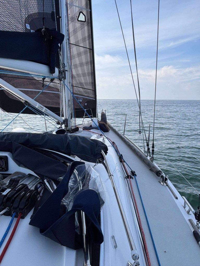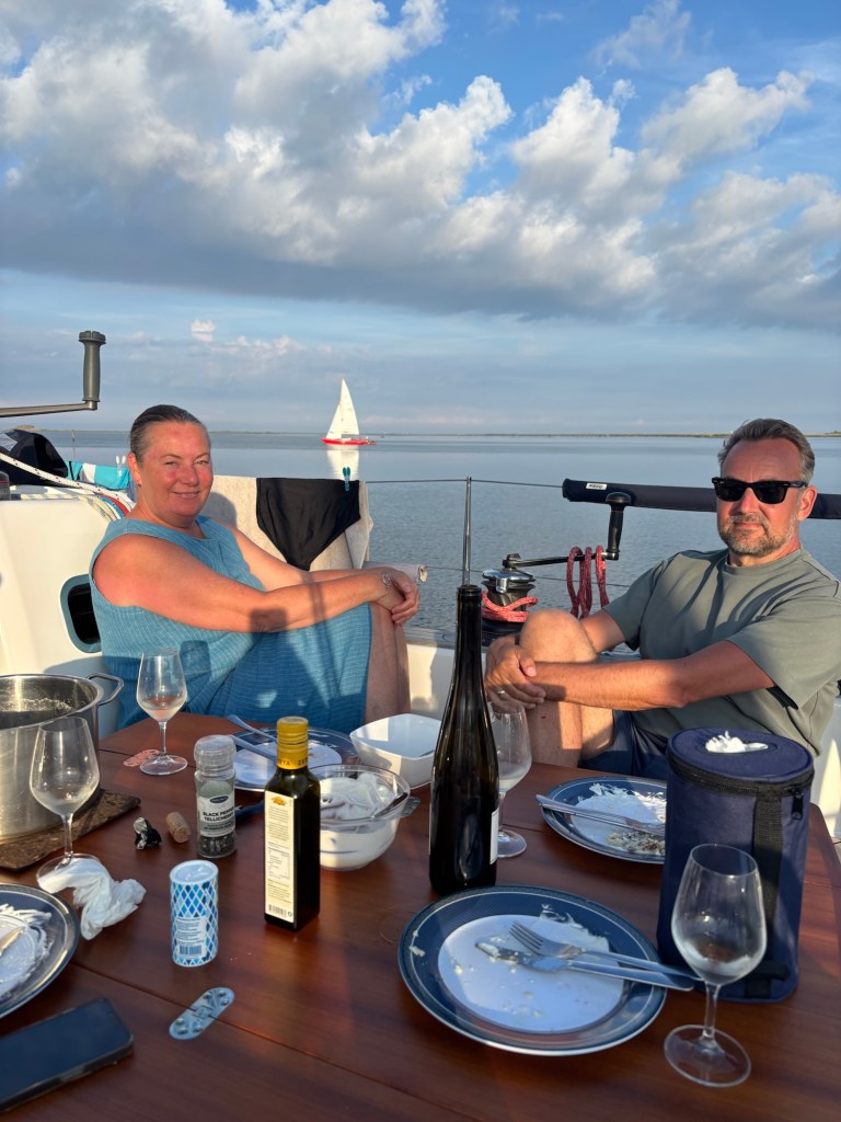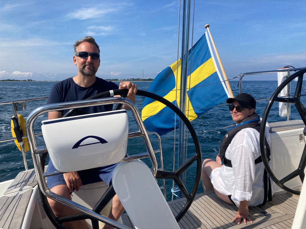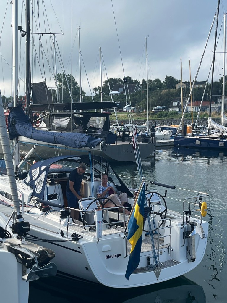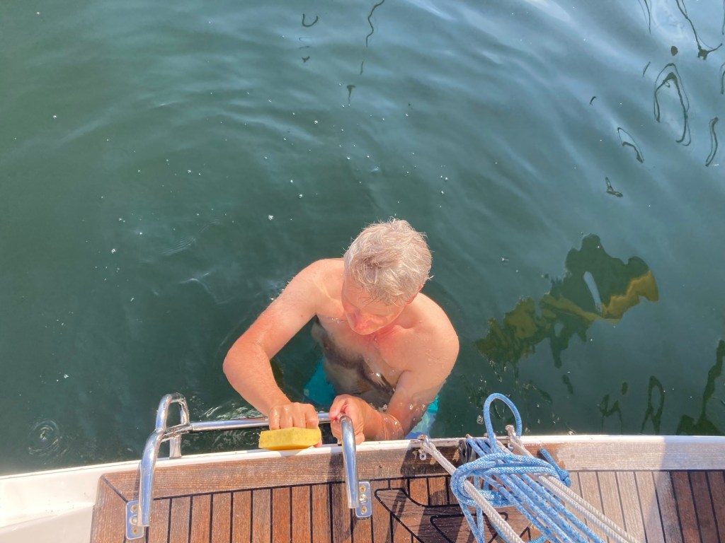 Ja, den här seglingsdagen kommer vi att drömma oss tillbaka till när höststormarna viner. Strålande sol, sköna långsamma vindar, bad efter båten och ja, Annika fick äntligen se tumlare! Och sedan också sälar när vi närmade oss land. Grannbåten i Oddens hamn hade berättat om Langør, en liten hamn på Samsø i ett naturområde som också erbjöd en skyddad svajvik. Dit gick vi, och lade oss där bredvid den göteborgska X-båt som vi stalkat ända sedan Gilleleje. Vi låg på utsidan piren och kunde bada från båten. Det behövdes, idag var det varmt.