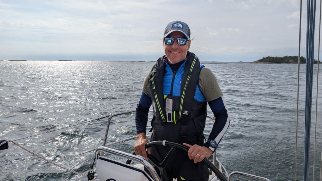 Så slår vinden om till syd och ökar och vi får en brusande färd söder om Askö där akterstaget får visa hur en mast ska krummas!