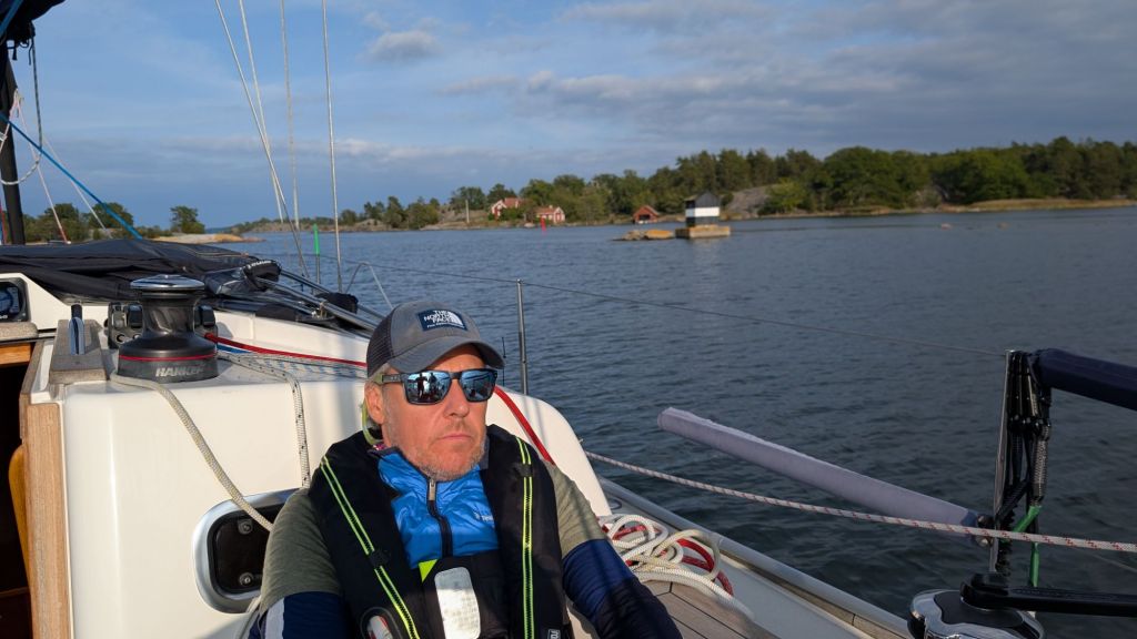 Skärgården öppnar upp och vinden dojjar ännu något. Motor förbi Västra Stendörren – här är så vackert! Vi vinkar till Arcona-entusiasten i Sävösundet. Här är också så vackert!