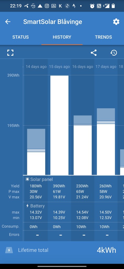 I natt vred vinden som den skulle och skepparen låg och sov ”helt oseriös” om man får tro frun i förpiken och det får man ju. Det kluckade först mot aktern med en jämn fin rytm. Sedan kom någon dunk- kluck. Skepparen fick till slut kolla vågorna men de krusade sig ju knappast så Blåvinge fick ligga kvar mot klippan.