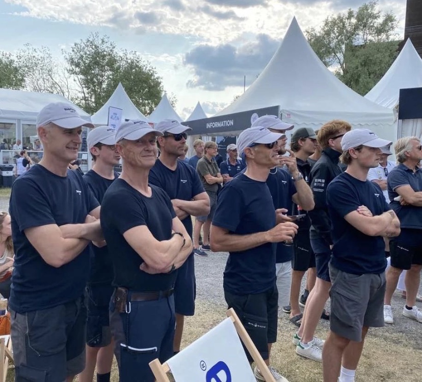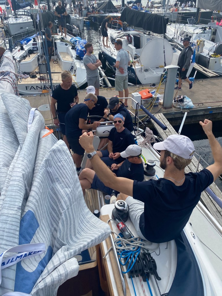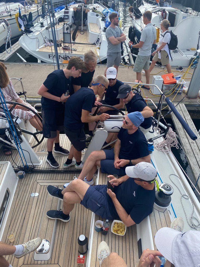 Peppad besättning och gäster tryckte in sig i salongen för GT, öl och snacks. Blött ute och ångande varm inne. Härlig stämning.