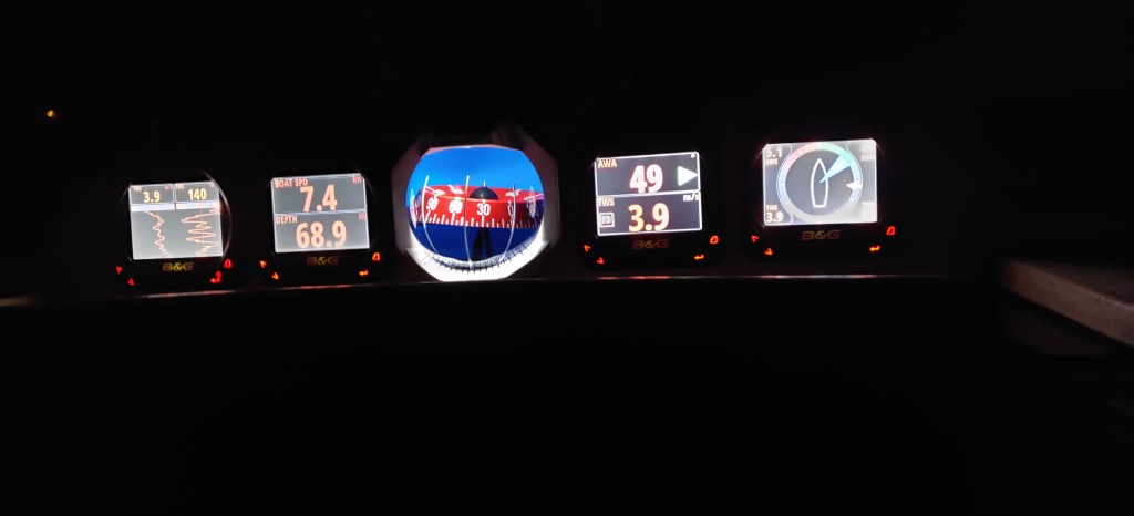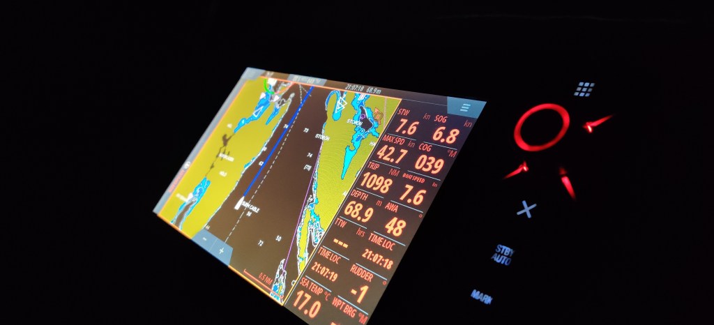 Spinnaren åker upp och vi övar gipp med en person på fördäck och vi tvingas till en längre freeflying för att tajma skärgårdens kobbar och skär. Skön fart.